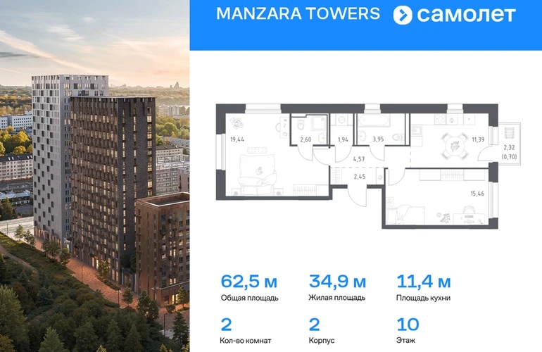 Предлагается 2-комнатная квартира комфорт-класса 62,5 кв.м в корпусе 2 на 10 этаже, в MANZARA TOWERS Квартира с предчистовой отделкой. Доступность дополнительных опций уточняйте у застройщика. Приобрести квартиру возможно по специальным акциям от застройщика, с текущими условиями акций можно ознакомиться в блоке «Акций». Цена динамическая и может отличаться, уточняйте актуальность у застройщика. Manzara Towers — это дома высотой от 7 до 24 этажей. В увеличенных окнах с зеркальной поверхностью отражаются облака и солнечные блики. Тихий двор с игровыми площадками и воркаут-пространством идеален для прогулок с кофе. На первом этаже есть выход на стилобат, где появятся зеленые оазисы и открытые террасы. Дома соединяет между собой частично прозрачный пешеходный мост. Предусмотрены подземный и 6-этажный многоуровневый паркинги. До ж/д вокзалов можно доехать за 20 минут. Или в обеденный перерыв встретиться с друзьями в центре города — дорога на машине займет около 15 минут. На первых этажах корпусов откроется детская поликлиника, ФОК с бассейном, магазины, кафе и салоны красоты. Для маленьких жителей уже работают 3 детских сада и лицей, до которых можно дойти за 6–15 минут. Во всех наших корпусах входы в светлые лобби находятся на уровне земли. На первом этаже есть специальные места для хранения колясок и велосипедов. #yan19-2r1714052#О застройщике
