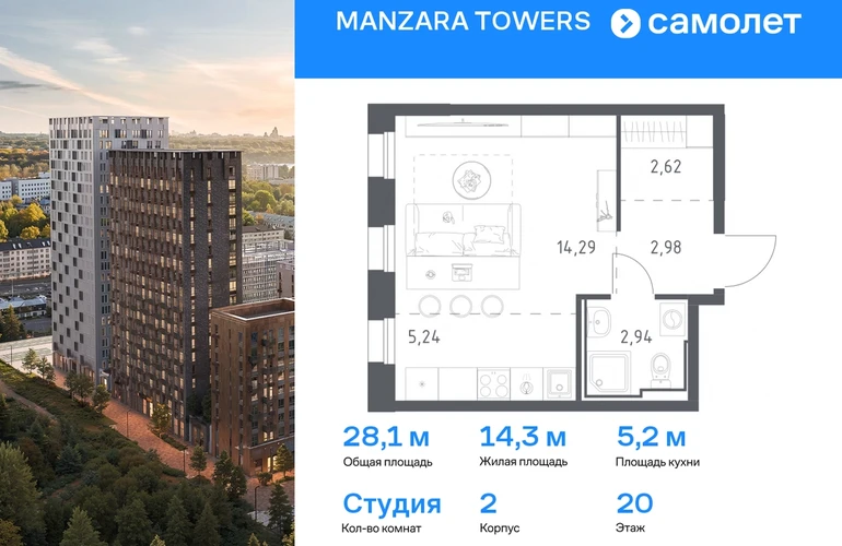 Строим кварталы для жизни с заботой о будущем. Предлагается квартира студия комфорт-класса 28,07 кв.м в корпусе 2 на 20 этаже, в MANZARA TOWERS Квартира с предчистовой отделкой. Доступность дополнительных опций уточняйте у застройщика. Приобрести квартиру возможно по специальным акциям от застройщика, с текущими условиями акций можно ознакомиться в блоке «Акций». Цена динамическая и может отличаться, уточняйте актуальность у застройщика. Manzara Towers — это дома высотой от 7 до 24 этажей. В увеличенных окнах с зеркальной поверхностью отражаются облака и солнечные блики. Тихий двор с игровыми площадками и воркаут-пространством идеален для прогулок с кофе. На первом этаже есть выход на стилобат, где появятся зеленые оазисы и открытые террасы. Дома соединяет между собой частично прозрачный пешеходный мост. Предусмотрены подземный и 6-этажный многоуровневый паркинги. До ж/д вокзалов можно доехать за 20 минут. Или в обеденный перерыв встретиться с друзьями в центре города — дорога на машине займет около 15 минут. На первых этажах корпусов откроется детская поликлиника, ФОК с бассейном, магазины, кафе и салоны красоты. Для маленьких жителей уже работают 3 детских сада и лицей, до которых можно дойти за 6–15 минут. Во всех наших корпусах входы в светлые лобби находятся на уровне земли. На первом этаже есть специальные места для хранения колясок и велосипедов. #yan19-2r1714063#О застройщике