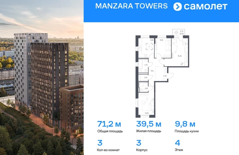 Предлагается 3-комнатная квартира комфорт-класса 71,19 кв.м в корпусе 3 на 4 этаже, в MANZARA TOWERS Квартира с предчистовой отделкой. Доступность дополнительных опций уточняйте у застройщика. Приобрести квартиру возможно по специальным акциям от застройщика, с текущими условиями акций можно ознакомиться в блоке “Акций”. Цена динамическая и может отличаться, уточняйте актуальность у застройщика. Manzara Towers — это дома высотой от 7 до 24 этажей. В увеличенных окнах с зеркальной поверхностью отражаются облака и солнечные блики. Тихий двор с игровыми площадками и воркаут-пространством идеален для прогулок с кофе. На первом этаже есть выход на стилобат, где появятся зеленые оазисы и открытые террасы. Дома соединяет между собой частично прозрачный пешеходный мост. Предусмотрены подземный и 6-этажный многоуровневый паркинги. До ж/д вокзалов можно доехать за 20 минут. Или в обеденный перерыв встретиться с друзьями в центре города — дорога на машине займет около 15 минут. На первых этажах корпусов откроется детская поликлиника, ФОК с бассейном, магазины, кафе и салоны красоты. Для маленьких жителей уже работают 3 детских сада и лицей, до которых можно дойти за 6–15 минут. Во всех наших корпусах входы в светлые лобби находятся на уровне земли. На первом этаже есть специальные места для хранения колясок и велосипедов. #yan19-2r1714083#О застройщике