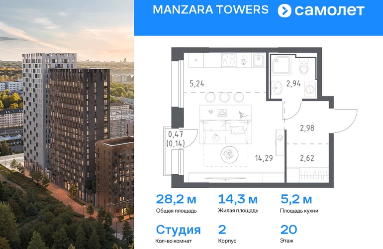 Предлагается квартира студия комфорт-класса 28,21 кв.м в корпусе 2 на 20 этаже, в MANZARA TOWERS Квартира с предчистовой отделкой. Доступность дополнительных опций уточняйте у застройщика. Приобрести квартиру возможно по специальным акциям от застройщика, с текущими условиями акций можно ознакомиться в блоке “Акций”. Цена динамическая и может отличаться, уточняйте актуальность у застройщика. Manzara Towers — это дома высотой от 7 до 24 этажей. В увеличенных окнах с зеркальной поверхностью отражаются облака и солнечные блики. Тихий двор с игровыми площадками и воркаут-пространством идеален для прогулок с кофе. На первом этаже есть выход на стилобат, где появятся зеленые оазисы и открытые террасы. Дома соединяет между собой частично прозрачный пешеходный мост. Предусмотрены подземный и 6-этажный многоуровневый паркинги. До ж/д вокзалов можно доехать за 20 минут. Или в обеденный перерыв встретиться с друзьями в центре города — дорога на машине займет около 15 минут. На первых этажах корпусов откроется детская поликлиника, ФОК с бассейном, магазины, кафе и салоны красоты. Для маленьких жителей уже работают 3 детских сада и лицей, до которых можно дойти за 6–15 минут. Во всех наших корпусах входы в светлые лобби находятся на уровне земли. На первом этаже есть специальные места для хранения колясок и велосипедов. #yan19-2r1714086#О застройщике