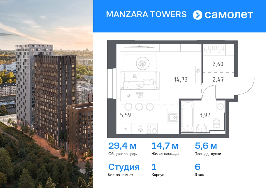 Предлагается квартира студия комфорт-класса 29,36 кв.м в корпусе 1 на 6 этаже, в MANZARA TOWERS Квартира с предчистовой отделкой. Доступность дополнительных опций уточняйте у застройщика. Приобрести квартиру возможно по специальным акциям от застройщика, с текущими условиями акций можно ознакомиться в блоке “Акций”. Цена динамическая и может отличаться, уточняйте актуальность у застройщика. Manzara Towers — это дома высотой от 7 до 24 этажей. В увеличенных окнах с зеркальной поверхностью отражаются облака и солнечные блики. Тихий двор с игровыми площадками и воркаут-пространством идеален для прогулок с кофе. На первом этаже есть выход на стилобат, где появятся зеленые оазисы и открытые террасы. Дома соединяет между собой частично прозрачный пешеходный мост. Предусмотрены подземный и 6-этажный многоуровневый паркинги. До ж/д вокзалов можно доехать за 20 минут. Или в обеденный перерыв встретиться с друзьями в центре города — дорога на машине займет около 15 минут. На первых этажах корпусов откроется детская поликлиника, ФОК с бассейном, магазины, кафе и салоны красоты. Для маленьких жителей уже работают 3 детских сада и лицей, до которых можно дойти за 6–15 минут. Во всех наших корпусах входы в светлые лобби находятся на уровне земли. На первом этаже есть специальные места для хранения колясок и велосипедов. #yan19-2r1716248#О застройщике