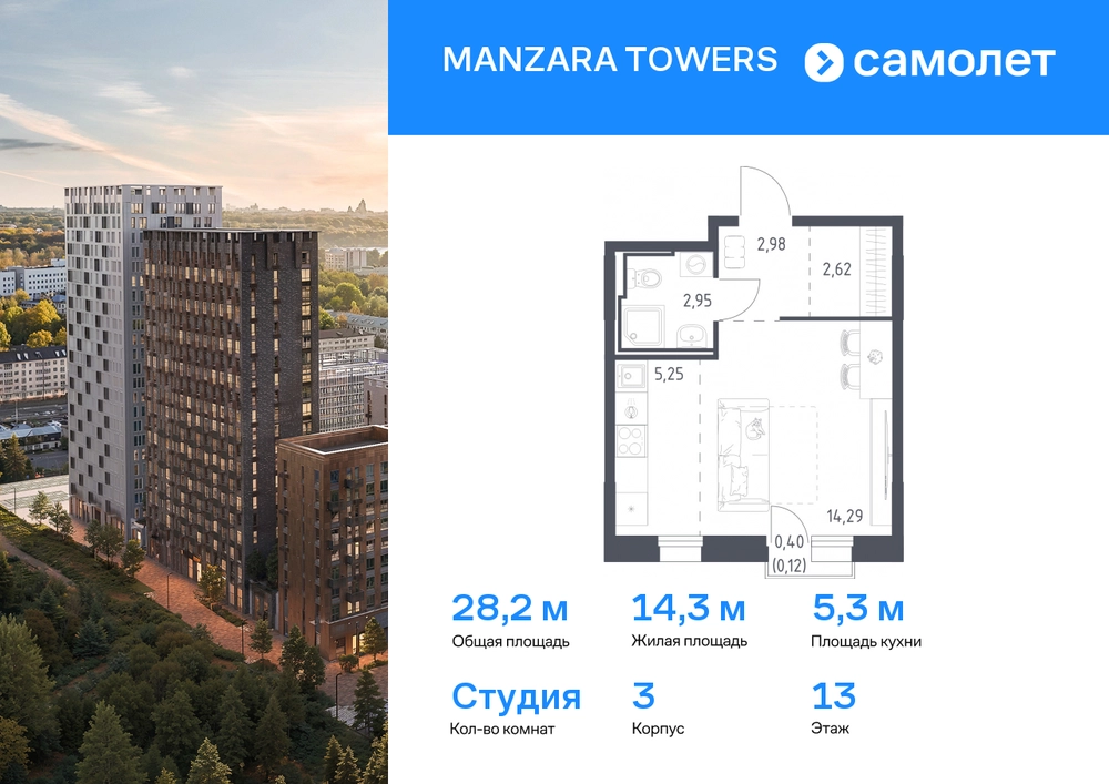 Предлагается квартира студия комфорт-класса 28,21 кв.м в корпусе 3 на 13 этаже, в MANZARA TOWERS Квартира с предчистовой отделкой. Доступность дополнительных опций уточняйте у застройщика. Планировкой предусмотрены: Прихожая - 2,98 м² Кухня-ниша - 5,25 м² Студия - 14,29 м² СУ_1 - 2,95 м² Гардеробная_1 - 2,62 м² Балкон_1 - 0,12 м² Приобрести квартиру возможно по специальным акциям от застройщика, с текущими условиями акций можно ознакомиться в блоке “Акций”. Цена динамическая и может отличаться, уточняйте актуальность у застройщика. Manzara Towers — это дома высотой от 7 до 24 этажей. В увеличенных окнах с зеркальной поверхностью отражаются облака и солнечные блики. Тихий двор с игровыми площадками и воркаут-пространством идеален для прогулок с кофе. На первом этаже есть выход на стилобат, где появятся зеленые оазисы и открытые террасы. Дома соединяет между собой частично прозрачный пешеходный мост. Предусмотрены подземный и 6-этажный многоуровневый паркинги. До ж/д вокзалов можно доехать за 20 минут. Или в обеденный перерыв встретиться с друзьями в центре города — дорога на машине займет около 15 минут. На первых этажах корпусов откроется детская поликлиника, ФОК с бассейном, магазины, кафе и салоны красоты. Для маленьких жителей уже работают 3 детских сада и лицей, до которых можно дойти за 6–15 минут. Во всех наших корпусах входы в светлые лобби находятся на уровне земли. На первом этаже есть специальные места для хранения колясок и велосипедов. #yan19-2r1716285#О застройщике