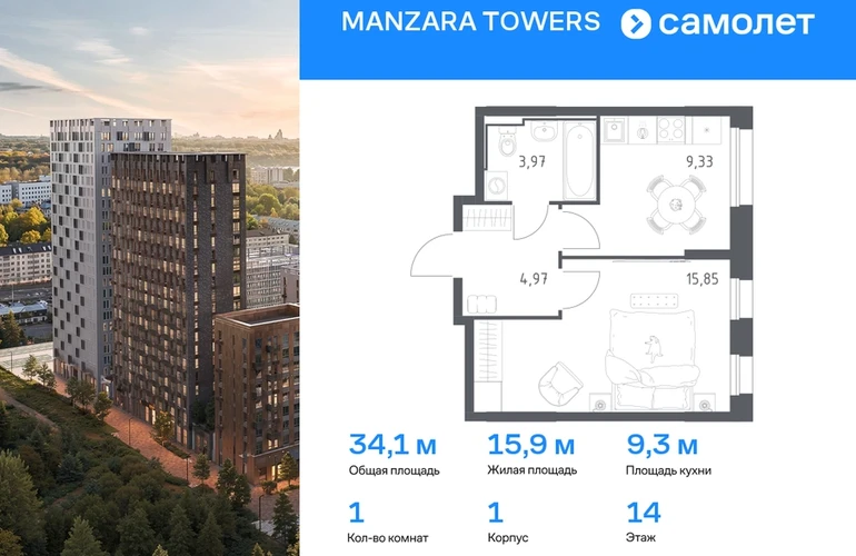 Предлагается 1-комнатная квартира комфорт-класса 34,12 кв.м в корпусе 1 на 14 этаже, в MANZARA TOWERS Квартира с предчистовой отделкой. Доступность дополнительных опций уточняйте у застройщика. Приобрести квартиру возможно по специальным акциям от застройщика, с текущими условиями акций можно ознакомиться в блоке “Акций”. Цена динамическая и может отличаться, уточняйте актуальность у застройщика. Manzara Towers — это дома высотой от 7 до 24 этажей. В увеличенных окнах с зеркальной поверхностью отражаются облака и солнечные блики. Тихий двор с игровыми площадками и воркаут-пространством идеален для прогулок с кофе. На первом этаже есть выход на стилобат, где появятся зеленые оазисы и открытые террасы. Дома соединяет между собой частично прозрачный пешеходный мост. Предусмотрены подземный и 6-этажный многоуровневый паркинги. До ж/д вокзалов можно доехать за 20 минут. Или в обеденный перерыв встретиться с друзьями в центре города — дорога на машине займет около 15 минут. На первых этажах корпусов откроется детская поликлиника, ФОК с бассейном, магазины, кафе и салоны красоты. Для маленьких жителей уже работают 3 детских сада и лицей, до которых можно дойти за 6–15 минут. Во всех наших корпусах входы в светлые лобби находятся на уровне земли. На первом этаже есть специальные места для хранения колясок и велосипедов. #yan19-2r1724154#О застройщике