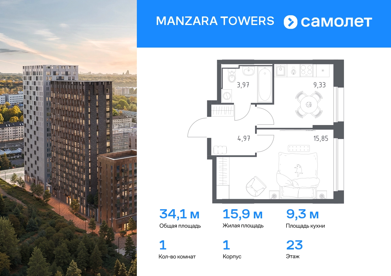 Предлагается 1-комнатная квартира комфорт-класса 34,12 кв.м в корпусе 1 на 23 этаже, в MANZARA TOWERS Квартира с предчистовой отделкой. Доступность дополнительных опций уточняйте у застройщика. Приобрести квартиру возможно по специальным акциям от застройщика, с текущими условиями акций можно ознакомиться в блоке «Акций». Цена динамическая и может отличаться, уточняйте актуальность у застройщика. Manzara Towers — это дома высотой от 7 до 24 этажей. В увеличенных окнах с зеркальной поверхностью отражаются облака и солнечные блики. Тихий двор с игровыми площадками и воркаут-пространством идеален для прогулок с кофе. На первом этаже есть выход на стилобат, где появятся зеленые оазисы и открытые террасы. Дома соединяет между собой частично прозрачный пешеходный мост. Предусмотрены подземный и 6-этажный многоуровневый паркинги. До ж/д вокзалов можно доехать за 20 минут. Или в обеденный перерыв встретиться с друзьями в центре города — дорога на машине займет около 15 минут. На первых этажах корпусов откроется детская поликлиника, ФОК с бассейном, магазины, кафе и салоны красоты. Для маленьких жителей уже работают 3 детских сада и лицей, до которых можно дойти за 6–15 минут. Во всех наших корпусах входы в светлые лобби находятся на уровне земли. На первом этаже есть специальные места для хранения колясок и велосипедов. #yan19-2r1729791#О застройщике