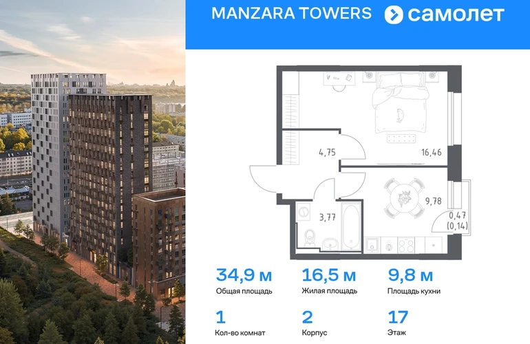 Предлагается 1-комнатная квартира комфорт-класса 34,9 кв.м в корпусе 2 на 17 этаже, в MANZARA TOWERS Квартира с предчистовой отделкой. Доступность дополнительных опций уточняйте у застройщика. Приобрести квартиру возможно по специальным акциям от застройщика, с текущими условиями акций можно ознакомиться в блоке “Акций”. Цена динамическая и может отличаться, уточняйте актуальность у застройщика. Manzara Towers — это дома высотой от 7 до 24 этажей. В увеличенных окнах с зеркальной поверхностью отражаются облака и солнечные блики. Тихий двор с игровыми площадками и воркаут-пространством идеален для прогулок с кофе. На первом этаже есть выход на стилобат, где появятся зеленые оазисы и открытые террасы. Дома соединяет между собой частично прозрачный пешеходный мост. Предусмотрены подземный и 6-этажный многоуровневый паркинги. До ж/д вокзалов можно доехать за 20 минут. Или в обеденный перерыв встретиться с друзьями в центре города — дорога на машине займет около 15 минут. На первых этажах корпусов откроется детская поликлиника, ФОК с бассейном, магазины, кафе и салоны красоты. Для маленьких жителей уже работают 3 детских сада и лицей, до которых можно дойти за 6–15 минут. Во всех наших корпусах входы в светлые лобби находятся на уровне земли. На первом этаже есть специальные места для хранения колясок и велосипедов. #yan19-2r1729793#О застройщике
