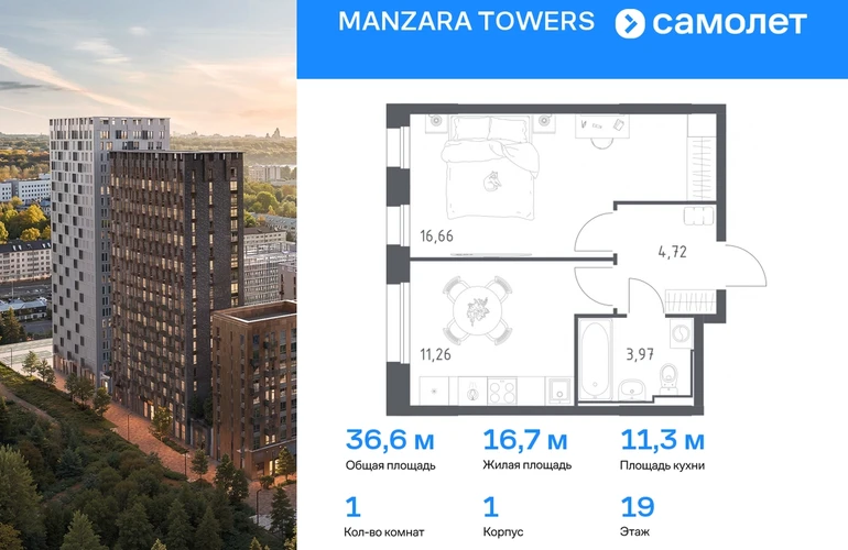 Предлагается 1-комнатная квартира комфорт-класса 36,61 кв.м в корпусе 1 на 19 этаже, в MANZARA TOWERS Квартира с предчистовой отделкой. Доступность дополнительных опций уточняйте у застройщика. Приобрести квартиру возможно по специальным акциям от застройщика, с текущими условиями акций можно ознакомиться в блоке “Акций”. Цена динамическая и может отличаться, уточняйте актуальность у застройщика. Manzara Towers — это дома высотой от 7 до 24 этажей. В увеличенных окнах с зеркальной поверхностью отражаются облака и солнечные блики. Тихий двор с игровыми площадками и воркаут-пространством идеален для прогулок с кофе. На первом этаже есть выход на стилобат, где появятся зеленые оазисы и открытые террасы. Дома соединяет между собой частично прозрачный пешеходный мост. Предусмотрены подземный и 6-этажный многоуровневый паркинги. До ж/д вокзалов можно доехать за 20 минут. Или в обеденный перерыв встретиться с друзьями в центре города — дорога на машине займет около 15 минут. На первых этажах корпусов откроется детская поликлиника, ФОК с бассейном, магазины, кафе и салоны красоты. Для маленьких жителей уже работают 3 детских сада и лицей, до которых можно дойти за 6–15 минут. Во всех наших корпусах входы в светлые лобби находятся на уровне земли. На первом этаже есть специальные места для хранения колясок и велосипедов. #yan19-2r1743729#О застройщике