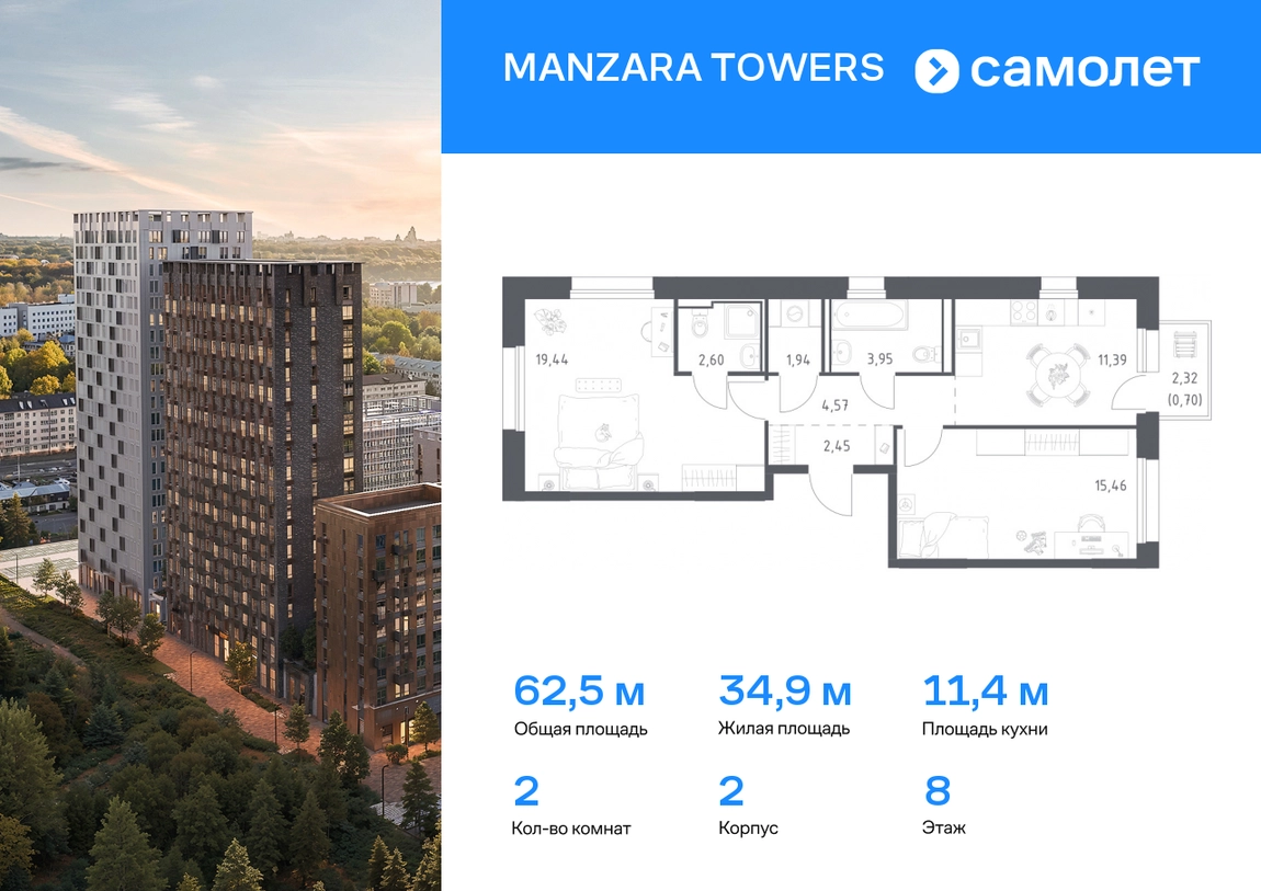 Предлагается 2-комнатная квартира комфорт-класса 62,5 кв.м в корпусе 2 на 8 этаже, в MANZARA TOWERS Квартира с предчистовой отделкой. Доступность дополнительных опций уточняйте у застройщика. Приобрести квартиру возможно по специальным акциям от застройщика, с текущими условиями акций можно ознакомиться в блоке «Акций». Цена динамическая и может отличаться, уточняйте актуальность у застройщика. Manzara Towers — это дома высотой от 7 до 24 этажей. В увеличенных окнах с зеркальной поверхностью отражаются облака и солнечные блики. Тихий двор с игровыми площадками и воркаут-пространством идеален для прогулок с кофе. На первом этаже есть выход на стилобат, где появятся зеленые оазисы и открытые террасы. Дома соединяет между собой частично прозрачный пешеходный мост. Предусмотрены подземный и 6-этажный многоуровневый паркинги. До ж/д вокзалов можно доехать за 20 минут. Или в обеденный перерыв встретиться с друзьями в центре города — дорога на машине займет около 15 минут. На первых этажах корпусов откроется детская поликлиника, ФОК с бассейном, магазины, кафе и салоны красоты. Для маленьких жителей уже работают 3 детских сада и лицей, до которых можно дойти за 6–15 минут. Во всех наших корпусах входы в светлые лобби находятся на уровне земли. На первом этаже есть специальные места для хранения колясок и велосипедов. #yan19-2r1746466#О застройщике