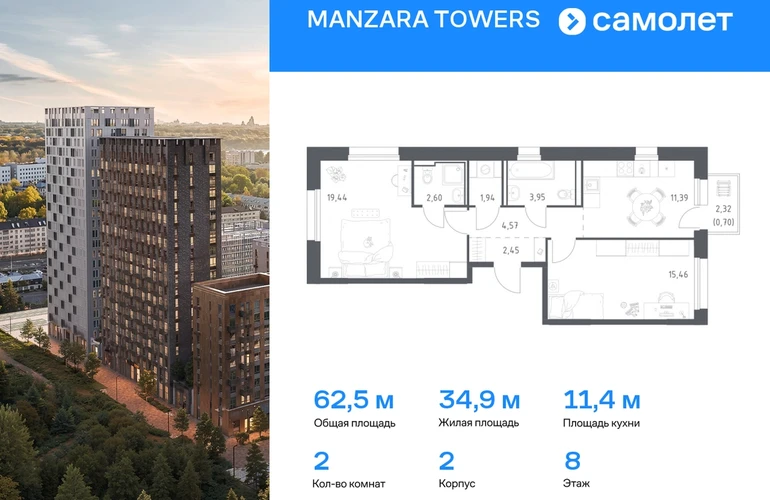 Предлагается 2-комнатная квартира комфорт-класса 62,5 кв.м в корпусе 2 на 8 этаже, в MANZARA TOWERS Квартира с предчистовой отделкой. Доступность дополнительных опций уточняйте у застройщика. Приобрести квартиру возможно по специальным акциям от застройщика, с текущими условиями акций можно ознакомиться в блоке «Акций». Цена динамическая и может отличаться, уточняйте актуальность у застройщика. Manzara Towers — это дома высотой от 7 до 24 этажей. В увеличенных окнах с зеркальной поверхностью отражаются облака и солнечные блики. Тихий двор с игровыми площадками и воркаут-пространством идеален для прогулок с кофе. На первом этаже есть выход на стилобат, где появятся зеленые оазисы и открытые террасы. Дома соединяет между собой частично прозрачный пешеходный мост. Предусмотрены подземный и 6-этажный многоуровневый паркинги. До ж/д вокзалов можно доехать за 20 минут. Или в обеденный перерыв встретиться с друзьями в центре города — дорога на машине займет около 15 минут. На первых этажах корпусов откроется детская поликлиника, ФОК с бассейном, магазины, кафе и салоны красоты. Для маленьких жителей уже работают 3 детских сада и лицей, до которых можно дойти за 6–15 минут. Во всех наших корпусах входы в светлые лобби находятся на уровне земли. На первом этаже есть специальные места для хранения колясок и велосипедов. #yan19-2r1746466#О застройщике