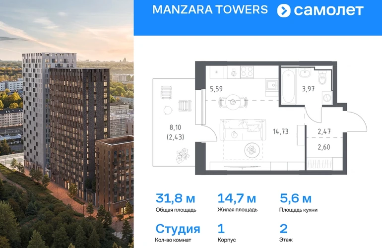 Строим кварталы для жизни с заботой о будущем. Предлагается квартира студия комфорт-класса 31,79 кв.м в корпусе 1 на 2 этаже, в MANZARA TOWERS Квартира с предчистовой отделкой. Доступность дополнительных опций уточняйте у застройщика. Приобрести квартиру возможно по специальным акциям от застройщика, с текущими условиями акций можно ознакомиться в блоке «Акций». Цена динамическая и может отличаться, уточняйте актуальность у застройщика. Manzara Towers — это дома высотой от 7 до 24 этажей. В увеличенных окнах с зеркальной поверхностью отражаются облака и солнечные блики. Тихий двор с игровыми площадками и воркаут-пространством идеален для прогулок с кофе. На первом этаже есть выход на стилобат, где появятся зеленые оазисы и открытые террасы. Дома соединяет между собой частично прозрачный пешеходный мост. Предусмотрены подземный и 6-этажный многоуровневый паркинги. До ж/д вокзалов можно доехать за 20 минут. Или в обеденный перерыв встретиться с друзьями в центре города — дорога на машине займет около 15 минут. На первых этажах корпусов откроется детская поликлиника, ФОК с бассейном, магазины, кафе и салоны красоты. Для маленьких жителей уже работают 3 детских сада и лицей, до которых можно дойти за 6–15 минут. Во всех наших корпусах входы в светлые лобби находятся на уровне земли. На первом этаже есть специальные места для хранения колясок и велосипедов. #yan19-2r1747366#О застройщике
