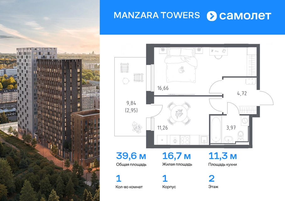 Предлагается 1-комнатная квартира комфорт-класса 39,56 кв.м в корпусе 1 на 2 этаже, в MANZARA TOWERS Квартира с предчистовой отделкой. Доступность дополнительных опций уточняйте у застройщика. Приобрести квартиру возможно по специальным акциям от застройщика, с текущими условиями акций можно ознакомиться в блоке “Акций”. Цена динамическая и может отличаться, уточняйте актуальность у застройщика. Manzara Towers — это дома высотой от 7 до 24 этажей. В увеличенных окнах с зеркальной поверхностью отражаются облака и солнечные блики. Тихий двор с игровыми площадками и воркаут-пространством идеален для прогулок с кофе. На первом этаже есть выход на стилобат, где появятся зеленые оазисы и открытые террасы. Дома соединяет между собой частично прозрачный пешеходный мост. Предусмотрены подземный и 6-этажный многоуровневый паркинги. До ж/д вокзалов можно доехать за 20 минут. Или в обеденный перерыв встретиться с друзьями в центре города — дорога на машине займет около 15 минут. На первых этажах корпусов откроется детская поликлиника, ФОК с бассейном, магазины, кафе и салоны красоты. Для маленьких жителей уже работают 3 детских сада и лицей, до которых можно дойти за 6–15 минут. Во всех наших корпусах входы в светлые лобби находятся на уровне земли. На первом этаже есть специальные места для хранения колясок и велосипедов. #yan19-2r1747367#О застройщике