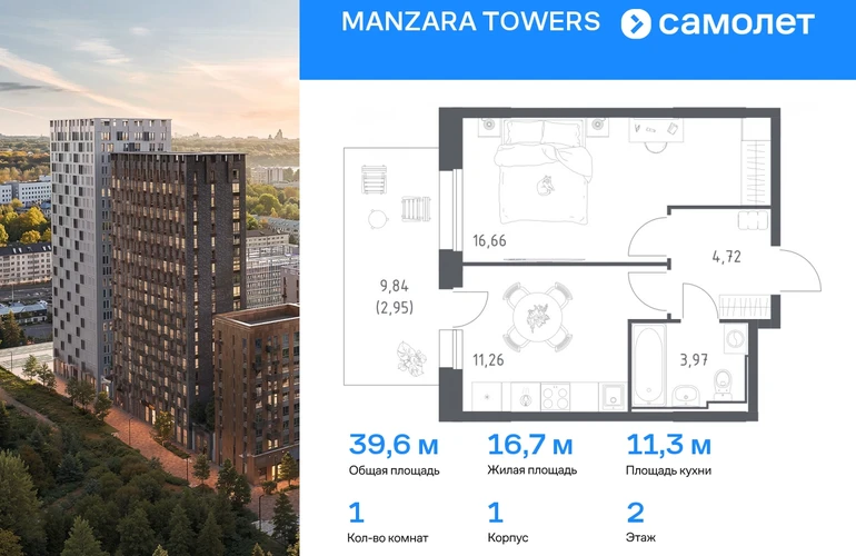 Предлагается 1-комнатная квартира комфорт-класса 39,56 кв.м в корпусе 1 на 2 этаже, в MANZARA TOWERS Квартира с предчистовой отделкой. Доступность дополнительных опций уточняйте у застройщика. Приобрести квартиру возможно по специальным акциям от застройщика, с текущими условиями акций можно ознакомиться в блоке “Акций”. Цена динамическая и может отличаться, уточняйте актуальность у застройщика. Manzara Towers — это дома высотой от 7 до 24 этажей. В увеличенных окнах с зеркальной поверхностью отражаются облака и солнечные блики. Тихий двор с игровыми площадками и воркаут-пространством идеален для прогулок с кофе. На первом этаже есть выход на стилобат, где появятся зеленые оазисы и открытые террасы. Дома соединяет между собой частично прозрачный пешеходный мост. Предусмотрены подземный и 6-этажный многоуровневый паркинги. До ж/д вокзалов можно доехать за 20 минут. Или в обеденный перерыв встретиться с друзьями в центре города — дорога на машине займет около 15 минут. На первых этажах корпусов откроется детская поликлиника, ФОК с бассейном, магазины, кафе и салоны красоты. Для маленьких жителей уже работают 3 детских сада и лицей, до которых можно дойти за 6–15 минут. Во всех наших корпусах входы в светлые лобби находятся на уровне земли. На первом этаже есть специальные места для хранения колясок и велосипедов. #yan19-2r1747367#О застройщике