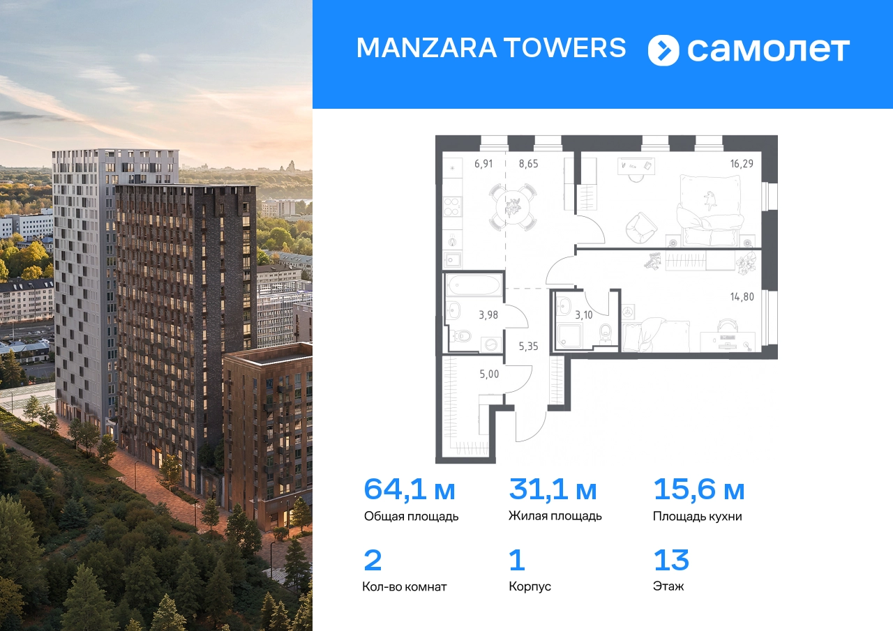 Предлагается 2-комнатная квартира комфорт-класса 64,08 кв.м в корпусе 1 на 13 этаже, в MANZARA TOWERS Квартира с предчистовой отделкой. Доступность дополнительных опций уточняйте у застройщика. Приобрести квартиру возможно по специальным акциям от застройщика, с текущими условиями акций можно ознакомиться в блоке «Акций». Цена динамическая и может отличаться, уточняйте актуальность у застройщика. Manzara Towers — это дома высотой от 7 до 24 этажей. В увеличенных окнах с зеркальной поверхностью отражаются облака и солнечные блики. Тихий двор с игровыми площадками и воркаут-пространством идеален для прогулок с кофе. На первом этаже есть выход на стилобат, где появятся зеленые оазисы и открытые террасы. Дома соединяет между собой частично прозрачный пешеходный мост. Предусмотрены подземный и 6-этажный многоуровневый паркинги. До ж/д вокзалов можно доехать за 20 минут. Или в обеденный перерыв встретиться с друзьями в центре города — дорога на машине займет около 15 минут. На первых этажах корпусов откроется детская поликлиника, ФОК с бассейном, магазины, кафе и салоны красоты. Для маленьких жителей уже работают 3 детских сада и лицей, до которых можно дойти за 6–15 минут. Во всех наших корпусах входы в светлые лобби находятся на уровне земли. На первом этаже есть специальные места для хранения колясок и велосипедов. #yan19-2r1747385#О застройщике