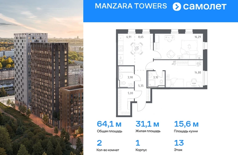Предлагается 2-комнатная квартира комфорт-класса 64,08 кв.м в корпусе 1 на 13 этаже, в MANZARA TOWERS Квартира с предчистовой отделкой. Доступность дополнительных опций уточняйте у застройщика. Приобрести квартиру возможно по специальным акциям от застройщика, с текущими условиями акций можно ознакомиться в блоке «Акций». Цена динамическая и может отличаться, уточняйте актуальность у застройщика. Manzara Towers — это дома высотой от 7 до 24 этажей. В увеличенных окнах с зеркальной поверхностью отражаются облака и солнечные блики. Тихий двор с игровыми площадками и воркаут-пространством идеален для прогулок с кофе. На первом этаже есть выход на стилобат, где появятся зеленые оазисы и открытые террасы. Дома соединяет между собой частично прозрачный пешеходный мост. Предусмотрены подземный и 6-этажный многоуровневый паркинги. До ж/д вокзалов можно доехать за 20 минут. Или в обеденный перерыв встретиться с друзьями в центре города — дорога на машине займет около 15 минут. На первых этажах корпусов откроется детская поликлиника, ФОК с бассейном, магазины, кафе и салоны красоты. Для маленьких жителей уже работают 3 детских сада и лицей, до которых можно дойти за 6–15 минут. Во всех наших корпусах входы в светлые лобби находятся на уровне земли. На первом этаже есть специальные места для хранения колясок и велосипедов. #yan19-2r1747385#О застройщике