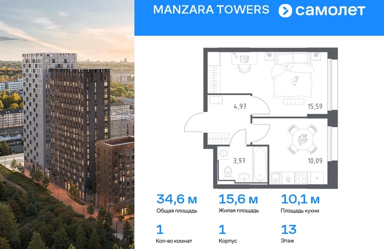 Строим кварталы для жизни с заботой о будущем. Предлагается 1-комнатная квартира комфорт-класса 34,62 кв.м в корпусе 1 на 13 этаже, в MANZARA TOWERS Квартира с предчистовой отделкой. Доступность дополнительных опций уточняйте у застройщика. Приобрести квартиру возможно по специальным акциям от застройщика, с текущими условиями акций можно ознакомиться в блоке «Акций». Цена динамическая и может отличаться, уточняйте актуальность у застройщика. Manzara Towers — это дома высотой от 7 до 24 этажей. В увеличенных окнах с зеркальной поверхностью отражаются облака и солнечные блики. Тихий двор с игровыми площадками и воркаут-пространством идеален для прогулок с кофе. На первом этаже есть выход на стилобат, где появятся зеленые оазисы и открытые террасы. Дома соединяет между собой частично прозрачный пешеходный мост. Предусмотрены подземный и 6-этажный многоуровневый паркинги. До ж/д вокзалов можно доехать за 20 минут. Или в обеденный перерыв встретиться с друзьями в центре города — дорога на машине займет около 15 минут. На первых этажах корпусов откроется детская поликлиника, ФОК с бассейном, магазины, кафе и салоны красоты. Для маленьких жителей уже работают 3 детских сада и лицей, до которых можно дойти за 6–15 минут. Во всех наших корпусах входы в светлые лобби находятся на уровне земли. На первом этаже есть специальные места для хранения колясок и велосипедов. #yan19-2r1747392#О застройщике