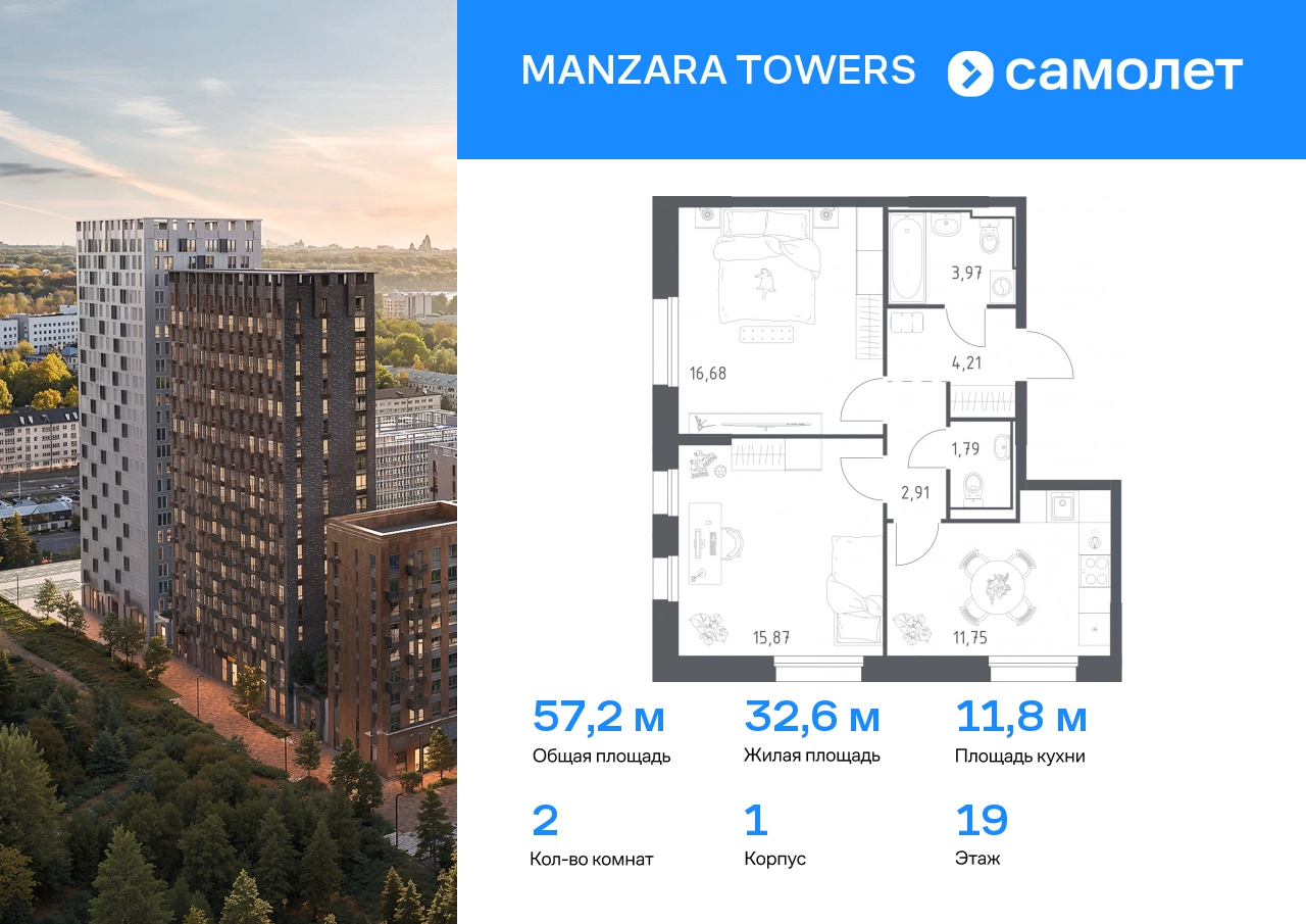 Предлагается 2-комнатная квартира комфорт-класса 57,18 кв.м в корпусе 1 на 19 этаже, в MANZARA TOWERS Квартира с предчистовой отделкой. Доступность дополнительных опций уточняйте у застройщика. Приобрести квартиру возможно по специальным акциям от застройщика, с текущими условиями акций можно ознакомиться в блоке «Акций». Цена динамическая и может отличаться, уточняйте актуальность у застройщика. Manzara Towers — это дома высотой от 7 до 24 этажей. В увеличенных окнах с зеркальной поверхностью отражаются облака и солнечные блики. Тихий двор с игровыми площадками и воркаут-пространством идеален для прогулок с кофе. На первом этаже есть выход на стилобат, где появятся зеленые оазисы и открытые террасы. Дома соединяет между собой частично прозрачный пешеходный мост. Предусмотрены подземный и 6-этажный многоуровневый паркинги. До ж/д вокзалов можно доехать за 20 минут. Или в обеденный перерыв встретиться с друзьями в центре города — дорога на машине займет около 15 минут. На первых этажах корпусов откроется детская поликлиника, ФОК с бассейном, магазины, кафе и салоны красоты. Для маленьких жителей уже работают 3 детских сада и лицей, до которых можно дойти за 6–15 минут. Во всех наших корпусах входы в светлые лобби находятся на уровне земли. На первом этаже есть специальные места для хранения колясок и велосипедов. #yan19-2r1747402#О застройщике