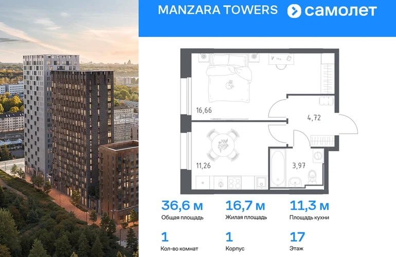 Предлагается 1-комнатная квартира комфорт-класса 36,61 кв.м в корпусе 1 на 17 этаже, в MANZARA TOWERS Квартира с предчистовой отделкой. Доступность дополнительных опций уточняйте у застройщика. Приобрести квартиру возможно по специальным акциям от застройщика, с текущими условиями акций можно ознакомиться в блоке “Акций”. Цена динамическая и может отличаться, уточняйте актуальность у застройщика. Manzara Towers — это дома высотой от 7 до 24 этажей. В увеличенных окнах с зеркальной поверхностью отражаются облака и солнечные блики. Тихий двор с игровыми площадками и воркаут-пространством идеален для прогулок с кофе. На первом этаже есть выход на стилобат, где появятся зеленые оазисы и открытые террасы. Дома соединяет между собой частично прозрачный пешеходный мост. Предусмотрены подземный и 6-этажный многоуровневый паркинги. До ж/д вокзалов можно доехать за 20 минут. Или в обеденный перерыв встретиться с друзьями в центре города — дорога на машине займет около 15 минут. На первых этажах корпусов откроется детская поликлиника, ФОК с бассейном, магазины, кафе и салоны красоты. Для маленьких жителей уже работают 3 детских сада и лицей, до которых можно дойти за 6–15 минут. Во всех наших корпусах входы в светлые лобби находятся на уровне земли. На первом этаже есть специальные места для хранения колясок и велосипедов. #yan19-2r1747403#О застройщике