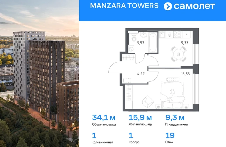 Предлагается 1-комнатная квартира комфорт-класса 34,12 кв.м в корпусе 1 на 19 этаже, в MANZARA TOWERS Квартира с предчистовой отделкой. Доступность дополнительных опций уточняйте у застройщика. Приобрести квартиру возможно по специальным акциям от застройщика, с текущими условиями акций можно ознакомиться в блоке «Акций». Цена динамическая и может отличаться, уточняйте актуальность у застройщика. Manzara Towers — это дома высотой от 7 до 24 этажей. В увеличенных окнах с зеркальной поверхностью отражаются облака и солнечные блики. Тихий двор с игровыми площадками и воркаут-пространством идеален для прогулок с кофе. На первом этаже есть выход на стилобат, где появятся зеленые оазисы и открытые террасы. Дома соединяет между собой частично прозрачный пешеходный мост. Предусмотрены подземный и 6-этажный многоуровневый паркинги. До ж/д вокзалов можно доехать за 20 минут. Или в обеденный перерыв встретиться с друзьями в центре города — дорога на машине займет около 15 минут. На первых этажах корпусов откроется детская поликлиника, ФОК с бассейном, магазины, кафе и салоны красоты. Для маленьких жителей уже работают 3 детских сада и лицей, до которых можно дойти за 6–15 минут. Во всех наших корпусах входы в светлые лобби находятся на уровне земли. На первом этаже есть специальные места для хранения колясок и велосипедов. #yan19-2r1747404#О застройщике
