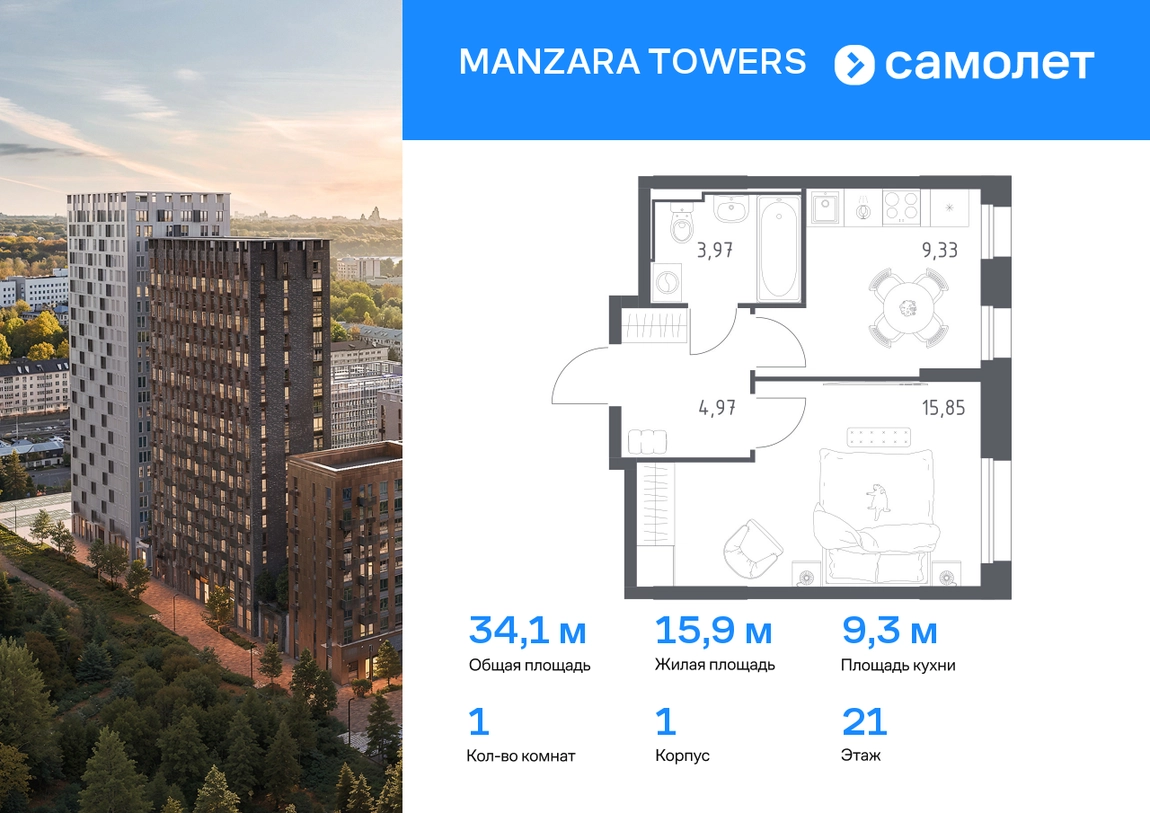 Предлагается 1-комнатная квартира комфорт-класса 34,12 кв.м в корпусе 1 на 21 этаже, в MANZARA TOWERS Квартира с предчистовой отделкой. Доступность дополнительных опций уточняйте у застройщика. Приобрести квартиру возможно по специальным акциям от застройщика, с текущими условиями акций можно ознакомиться в блоке «Акций». Цена динамическая и может отличаться, уточняйте актуальность у застройщика. Manzara Towers — это дома высотой от 7 до 24 этажей. В увеличенных окнах с зеркальной поверхностью отражаются облака и солнечные блики. Тихий двор с игровыми площадками и воркаут-пространством идеален для прогулок с кофе. На первом этаже есть выход на стилобат, где появятся зеленые оазисы и открытые террасы. Дома соединяет между собой частично прозрачный пешеходный мост. Предусмотрены подземный и 6-этажный многоуровневый паркинги. До ж/д вокзалов можно доехать за 20 минут. Или в обеденный перерыв встретиться с друзьями в центре города — дорога на машине займет около 15 минут. На первых этажах корпусов откроется детская поликлиника, ФОК с бассейном, магазины, кафе и салоны красоты. Для маленьких жителей уже работают 3 детских сада и лицей, до которых можно дойти за 6–15 минут. Во всех наших корпусах входы в светлые лобби находятся на уровне земли. На первом этаже есть специальные места для хранения колясок и велосипедов. #yan19-2r1747407#О застройщике
