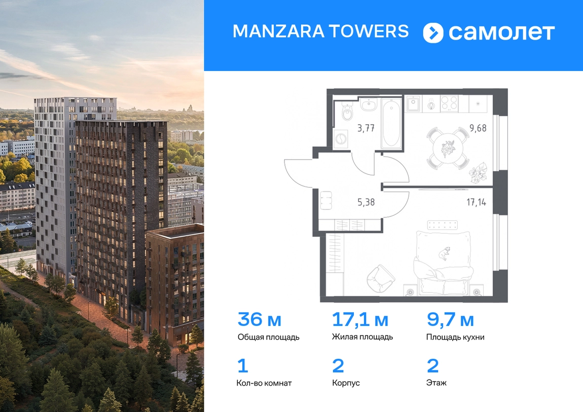 Предлагается 1-комнатная квартира комфорт-класса 35,97 кв.м в корпусе 2 на 2 этаже, в MANZARA TOWERS Квартира с предчистовой отделкой. Доступность дополнительных опций уточняйте у застройщика. Приобрести квартиру возможно по специальным акциям от застройщика, с текущими условиями акций можно ознакомиться в блоке “Акций”. Цена динамическая и может отличаться, уточняйте актуальность у застройщика. Manzara Towers — это дома высотой от 7 до 24 этажей. В увеличенных окнах с зеркальной поверхностью отражаются облака и солнечные блики. Тихий двор с игровыми площадками и воркаут-пространством идеален для прогулок с кофе. На первом этаже есть выход на стилобат, где появятся зеленые оазисы и открытые террасы. Дома соединяет между собой частично прозрачный пешеходный мост. Предусмотрены подземный и 6-этажный многоуровневый паркинги. До ж/д вокзалов можно доехать за 20 минут. Или в обеденный перерыв встретиться с друзьями в центре города — дорога на машине займет около 15 минут. На первых этажах корпусов откроется детская поликлиника, ФОК с бассейном, магазины, кафе и салоны красоты. Для маленьких жителей уже работают 3 детских сада и лицей, до которых можно дойти за 6–15 минут. Во всех наших корпусах входы в светлые лобби находятся на уровне земли. На первом этаже есть специальные места для хранения колясок и велосипедов. #yan19-2r1747420#О застройщике