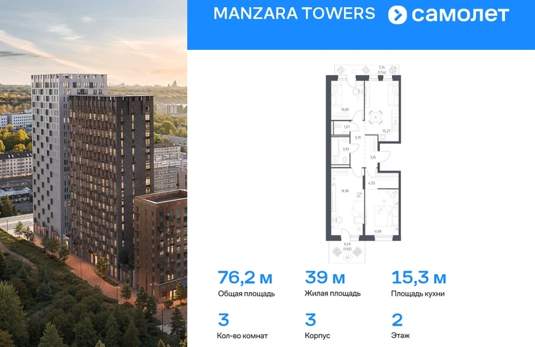 Предлагается 3-комнатная квартира комфорт-класса 76,17 кв.м в корпусе 3 на 2 этаже, в MANZARA TOWERS Квартира с черновой отделкой. Доступность опции "отделка" и возможность комплектации мебелью и декором уточняйте у застройщика. Приобрести квартиру возможно по специальным акциям от застройщика, с текущими условиями акций можно ознакомиться в блоке “Акций”. Цена динамическая и может отличаться, уточняйте актуальность у застройщика. Manzara Towers — это дома высотой от 7 до 24 этажей. В увеличенных окнах с зеркальной поверхностью отражаются облака и солнечные блики. Тихий двор с игровыми площадками и воркаут-пространством идеален для прогулок с кофе. На первом этаже есть выход на стилобат, где появятся зеленые оазисы и открытые террасы. Дома соединяет между собой частично прозрачный пешеходный мост. Предусмотрены подземный и 6-этажный многоуровневый паркинги. До ж/д вокзалов можно доехать за 20 минут. Или в обеденный перерыв встретиться с друзьями в центре города — дорога на машине займет около 15 минут. На первых этажах корпусов откроется детская поликлиника, ФОК с бассейном, магазины, кафе и салоны красоты. Для маленьких жителей уже работают 3 детских сада и лицей, до которых можно дойти за 6–15 минут. Во всех наших корпусах входы в светлые лобби находятся на уровне земли. На первом этаже есть специальные места для хранения колясок и велосипедов. #yan19-2r1747468#О застройщике