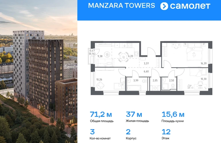Строим кварталы для жизни с заботой о будущем. Предлагается 3-комнатная квартира комфорт-класса 71,18 кв.м в корпусе 2 на 12 этаже, в MANZARA TOWERS Квартира с предчистовой отделкой. Доступность дополнительных опций уточняйте у застройщика. Приобрести квартиру возможно по специальным акциям от застройщика, с текущими условиями акций можно ознакомиться в блоке «Акций». Цена динамическая и может отличаться, уточняйте актуальность у застройщика. Manzara Towers — это дома высотой от 7 до 24 этажей. В увеличенных окнах с зеркальной поверхностью отражаются облака и солнечные блики. Тихий двор с игровыми площадками и воркаут-пространством идеален для прогулок с кофе. На первом этаже есть выход на стилобат, где появятся зеленые оазисы и открытые террасы. Дома соединяет между собой частично прозрачный пешеходный мост. Предусмотрены подземный и 6-этажный многоуровневый паркинги. До ж/д вокзалов можно доехать за 20 минут. Или в обеденный перерыв встретиться с друзьями в центре города — дорога на машине займет около 15 минут. На первых этажах корпусов откроется детская поликлиника, ФОК с бассейном, магазины, кафе и салоны красоты. Для маленьких жителей уже работают 3 детских сада и лицей, до которых можно дойти за 6–15 минут. Во всех наших корпусах входы в светлые лобби находятся на уровне земли. На первом этаже есть специальные места для хранения колясок и велосипедов. #yan19-2r1758289#О застройщике