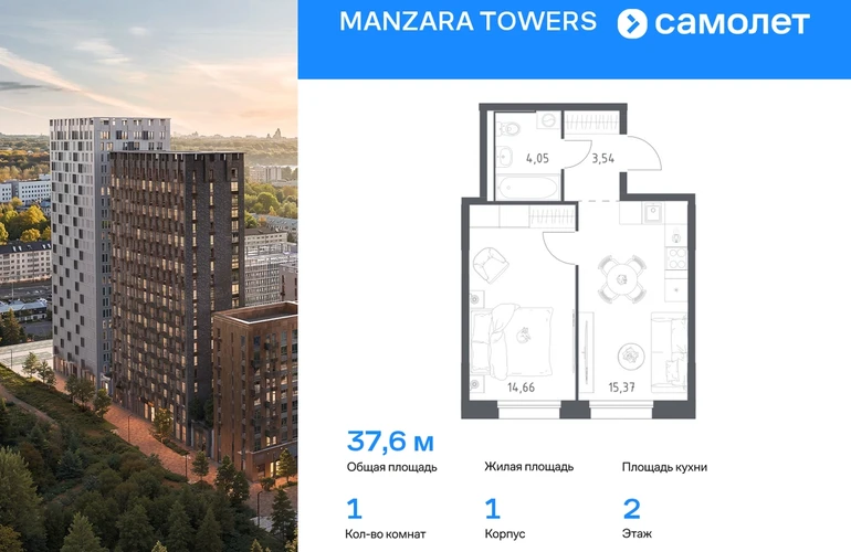 Строим кварталы для жизни с заботой о будущем. Предлагается 1-комнатная квартира комфорт-класса 37,62 кв.м в корпусе 1 на 2 этаже, в MANZARA TOWERS Квартира с предчистовой отделкой. Доступность дополнительных опций уточняйте у застройщика. Приобрести квартиру возможно по специальным акциям от застройщика, с текущими условиями акций можно ознакомиться в блоке «Акций». Цена динамическая и может отличаться, уточняйте актуальность у застройщика. Manzara Towers — это дома высотой от 7 до 24 этажей. В увеличенных окнах с зеркальной поверхностью отражаются облака и солнечные блики. Тихий двор с игровыми площадками и воркаут-пространством идеален для прогулок с кофе. На первом этаже есть выход на стилобат, где появятся зеленые оазисы и открытые террасы. Дома соединяет между собой частично прозрачный пешеходный мост. Предусмотрены подземный и 6-этажный многоуровневый паркинги. До ж/д вокзалов можно доехать за 20 минут. Или в обеденный перерыв встретиться с друзьями в центре города — дорога на машине займет около 15 минут. На первых этажах корпусов откроется детская поликлиника, ФОК с бассейном, магазины, кафе и салоны красоты. Для маленьких жителей уже работают 3 детских сада и лицей, до которых можно дойти за 6–15 минут. Во всех наших корпусах входы в светлые лобби находятся на уровне земли. На первом этаже есть специальные места для хранения колясок и велосипедов. #yan19-2r1769616#О застройщике