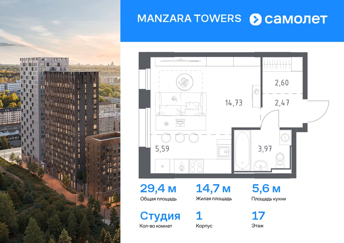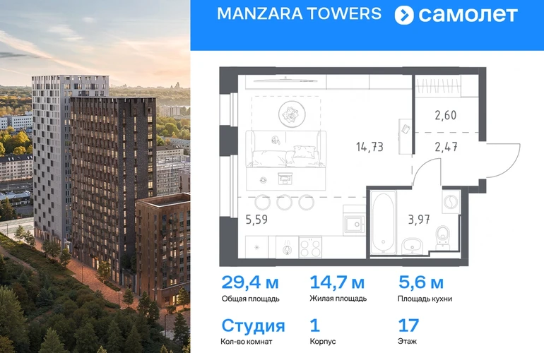 Предлагается квартира студия комфорт-класса 29,36 кв.м в корпусе 1 на 17 этаже, в MANZARA TOWERS Квартира с предчистовой отделкой. Доступность дополнительных опций уточняйте у застройщика. Приобрести квартиру возможно по специальным акциям от застройщика, с текущими условиями акций можно ознакомиться в блоке «Акций». Цена динамическая и может отличаться, уточняйте актуальность у застройщика. Manzara Towers — это дома высотой от 7 до 24 этажей. В увеличенных окнах с зеркальной поверхностью отражаются облака и солнечные блики. Тихий двор с игровыми площадками и воркаут-пространством идеален для прогулок с кофе. На первом этаже есть выход на стилобат, где появятся зеленые оазисы и открытые террасы. Дома соединяет между собой частично прозрачный пешеходный мост. Предусмотрены подземный и 6-этажный многоуровневый паркинги. До ж/д вокзалов можно доехать за 20 минут. Или в обеденный перерыв встретиться с друзьями в центре города — дорога на машине займет около 15 минут. На первых этажах корпусов откроется детская поликлиника, ФОК с бассейном, магазины, кафе и салоны красоты. Для маленьких жителей уже работают 3 детских сада и лицей, до которых можно дойти за 6–15 минут. Во всех наших корпусах входы в светлые лобби находятся на уровне земли. На первом этаже есть специальные места для хранения колясок и велосипедов. #yan19-2r1769619#О застройщике