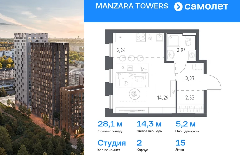 Предлагается квартира студия комфорт-класса 28,07 кв.м в корпусе 2 на 15 этаже, в MANZARA TOWERS Квартира с предчистовой отделкой. Доступность дополнительных опций уточняйте у застройщика. Приобрести квартиру возможно по специальным акциям от застройщика, с текущими условиями акций можно ознакомиться в блоке “Акций”. Цена динамическая и может отличаться, уточняйте актуальность у застройщика. Manzara Towers — это дома высотой от 7 до 24 этажей. В увеличенных окнах с зеркальной поверхностью отражаются облака и солнечные блики. Тихий двор с игровыми площадками и воркаут-пространством идеален для прогулок с кофе. На первом этаже есть выход на стилобат, где появятся зеленые оазисы и открытые террасы. Дома соединяет между собой частично прозрачный пешеходный мост. Предусмотрены подземный и 6-этажный многоуровневый паркинги. До ж/д вокзалов можно доехать за 20 минут. Или в обеденный перерыв встретиться с друзьями в центре города — дорога на машине займет около 15 минут. На первых этажах корпусов откроется детская поликлиника, ФОК с бассейном, магазины, кафе и салоны красоты. Для маленьких жителей уже работают 3 детских сада и лицей, до которых можно дойти за 6–15 минут. Во всех наших корпусах входы в светлые лобби находятся на уровне земли. На первом этаже есть специальные места для хранения колясок и велосипедов. #yan19-2r1770862#О застройщике
