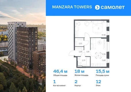 Предлагается 1-комнатная квартира комфорт-класса 46,42 кв.м в корпусе 2 на 12 этаже, в MANZARA TOWERS Квартира с предчистовой отделкой. Доступность дополнительных опций уточняйте у застройщика. Приобрести квартиру возможно по специальным акциям от застройщика, с текущими условиями акций можно ознакомиться в блоке “Акций”. Цена динамическая и может отличаться, уточняйте актуальность у застройщика. Manzara Towers — это дома высотой от 7 до 24 этажей. В увеличенных окнах с зеркальной поверхностью отражаются облака и солнечные блики. Тихий двор с игровыми площадками и воркаут-пространством идеален для прогулок с кофе. На первом этаже есть выход на стилобат, где появятся зеленые оазисы и открытые террасы. Дома соединяет между собой частично прозрачный пешеходный мост. Предусмотрены подземный и 6-этажный многоуровневый паркинги. До ж/д вокзалов можно доехать за 20 минут. Или в обеденный перерыв встретиться с друзьями в центре города — дорога на машине займет около 15 минут. На первых этажах корпусов откроется детская поликлиника, ФОК с бассейном, магазины, кафе и салоны красоты. Для маленьких жителей уже работают 3 детских сада и лицей, до которых можно дойти за 6–15 минут. Во всех наших корпусах входы в светлые лобби находятся на уровне земли. На первом этаже есть специальные места для хранения колясок и велосипедов. #yan19-2r1771249#О застройщике