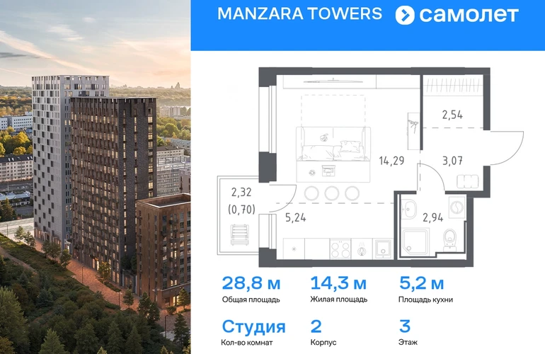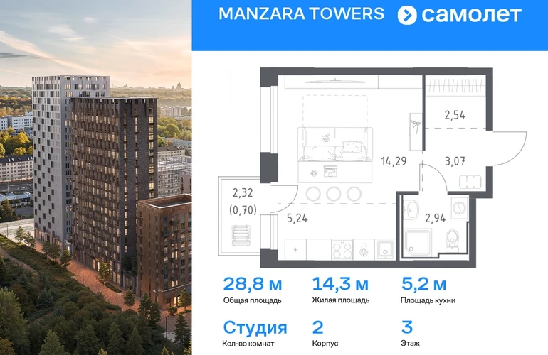 Строим кварталы для жизни с заботой о будущем. Предлагается квартира студия комфорт-класса 28,78 кв.м в корпусе 2 на 3 этаже, в MANZARA TOWERS Квартира с предчистовой отделкой. Доступность дополнительных опций уточняйте у застройщика. Приобрести квартиру возможно по специальным акциям от застройщика, с текущими условиями акций можно ознакомиться в блоке «Акций». Цена динамическая и может отличаться, уточняйте актуальность у застройщика. Manzara Towers — это дома высотой от 7 до 24 этажей. В увеличенных окнах с зеркальной поверхностью отражаются облака и солнечные блики. Тихий двор с игровыми площадками и воркаут-пространством идеален для прогулок с кофе. На первом этаже есть выход на стилобат, где появятся зеленые оазисы и открытые террасы. Дома соединяет между собой частично прозрачный пешеходный мост. Предусмотрены подземный и 6-этажный многоуровневый паркинги. До ж/д вокзалов можно доехать за 20 минут. Или в обеденный перерыв встретиться с друзьями в центре города — дорога на машине займет около 15 минут. На первых этажах корпусов откроется детская поликлиника, ФОК с бассейном, магазины, кафе и салоны красоты. Для маленьких жителей уже работают 3 детских сада и лицей, до которых можно дойти за 6–15 минут. Во всех наших корпусах входы в светлые лобби находятся на уровне земли. На первом этаже есть специальные места для хранения колясок и велосипедов. #yan19-2r1771828#О застройщике
