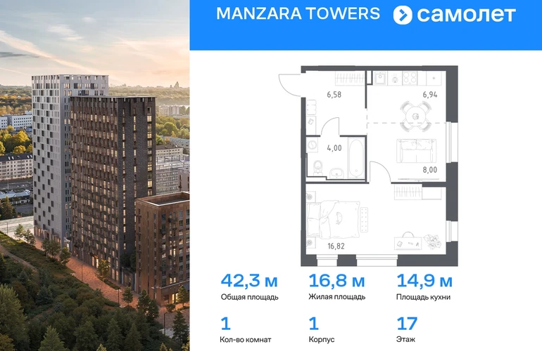 Строим кварталы для жизни с заботой о будущем. Предлагается 1-комнатная квартира комфорт-класса 42,34 кв.м в корпусе 1 на 17 этаже, в MANZARA TOWERS Квартира с предчистовой отделкой. Доступность дополнительных опций уточняйте у застройщика. Приобрести квартиру возможно по специальным акциям от застройщика, с текущими условиями акций можно ознакомиться в блоке «Акций». Цена динамическая и может отличаться, уточняйте актуальность у застройщика. Manzara Towers — это дома высотой от 7 до 24 этажей. В увеличенных окнах с зеркальной поверхностью отражаются облака и солнечные блики. Тихий двор с игровыми площадками и воркаут-пространством идеален для прогулок с кофе. На первом этаже есть выход на стилобат, где появятся зеленые оазисы и открытые террасы. Дома соединяет между собой частично прозрачный пешеходный мост. Предусмотрены подземный и 6-этажный многоуровневый паркинги. До ж/д вокзалов можно доехать за 20 минут. Или в обеденный перерыв встретиться с друзьями в центре города — дорога на машине займет около 15 минут. На первых этажах корпусов откроется детская поликлиника, ФОК с бассейном, магазины, кафе и салоны красоты. Для маленьких жителей уже работают 3 детских сада и лицей, до которых можно дойти за 6–15 минут. Во всех наших корпусах входы в светлые лобби находятся на уровне земли. На первом этаже есть специальные места для хранения колясок и велосипедов. #yan19-2r1777848#О застройщике