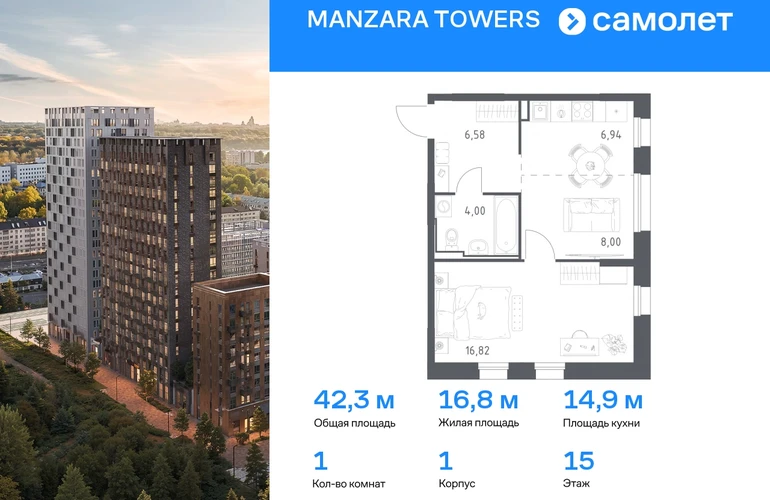 Строим кварталы для жизни с заботой о будущем. Предлагается 1-комнатная квартира комфорт-класса 42,34 кв.м в корпусе 1 на 15 этаже, в MANZARA TOWERS Квартира с предчистовой отделкой. Доступность дополнительных опций уточняйте у застройщика. Приобрести квартиру возможно по специальным акциям от застройщика, с текущими условиями акций можно ознакомиться в блоке «Акций». Цена динамическая и может отличаться, уточняйте актуальность у застройщика. Manzara Towers — это дома высотой от 7 до 24 этажей. В увеличенных окнах с зеркальной поверхностью отражаются облака и солнечные блики. Тихий двор с игровыми площадками и воркаут-пространством идеален для прогулок с кофе. На первом этаже есть выход на стилобат, где появятся зеленые оазисы и открытые террасы. Дома соединяет между собой частично прозрачный пешеходный мост. Предусмотрены подземный и 6-этажный многоуровневый паркинги. До ж/д вокзалов можно доехать за 20 минут. Или в обеденный перерыв встретиться с друзьями в центре города — дорога на машине займет около 15 минут. На первых этажах корпусов откроется детская поликлиника, ФОК с бассейном, магазины, кафе и салоны красоты. Для маленьких жителей уже работают 3 детских сада и лицей, до которых можно дойти за 6–15 минут. Во всех наших корпусах входы в светлые лобби находятся на уровне земли. На первом этаже есть специальные места для хранения колясок и велосипедов. #yan19-2r1781276#О застройщике