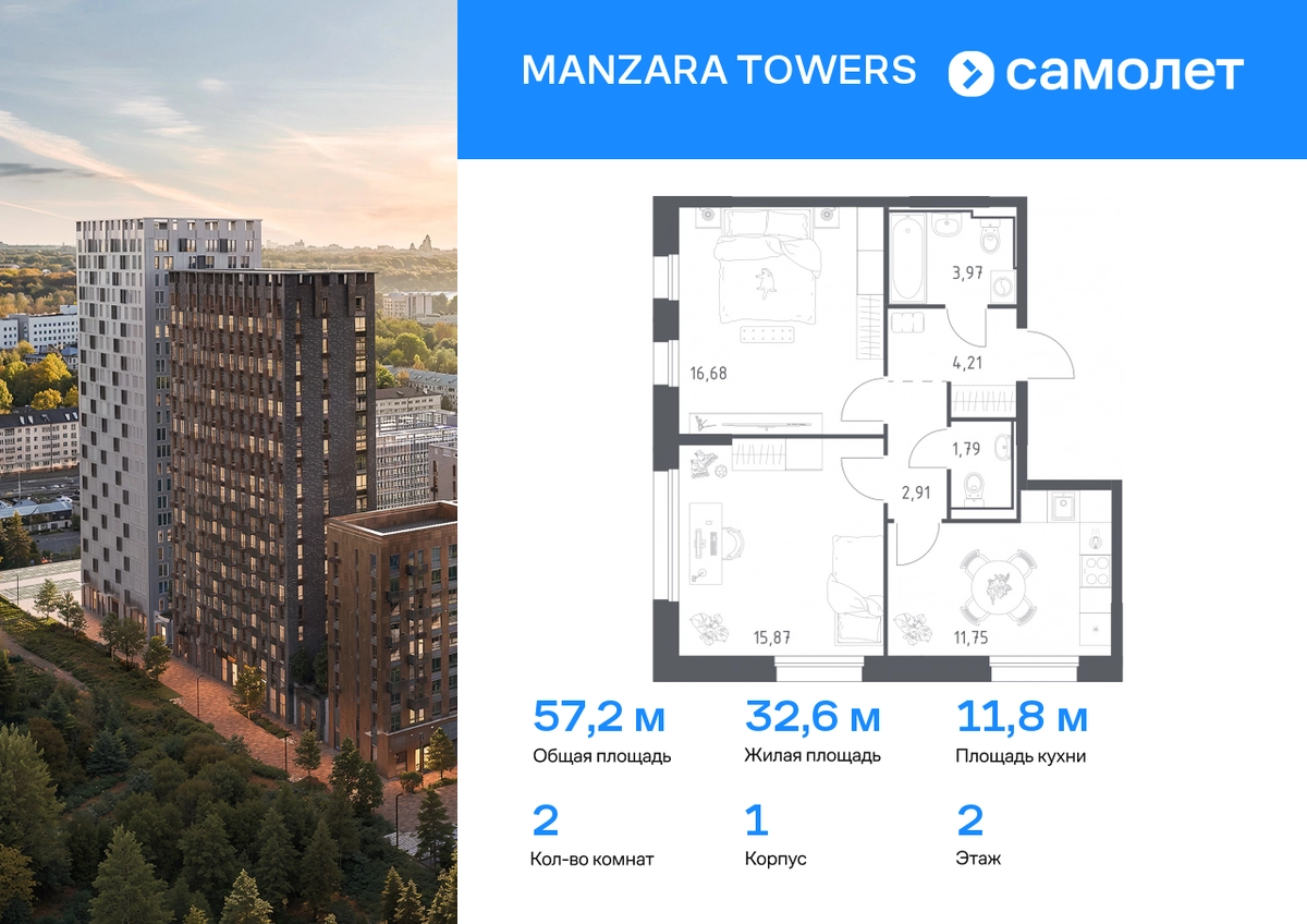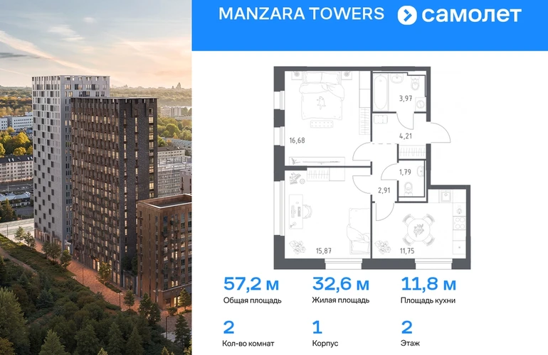 Предлагается 2-комнатная квартира комфорт-класса 57,18 кв.м в корпусе 1 на 2 этаже, в MANZARA TOWERS Квартира с предчистовой отделкой. Доступность дополнительных опций уточняйте у застройщика. Приобрести квартиру возможно по специальным акциям от застройщика, с текущими условиями акций можно ознакомиться в блоке “Акций”. Цена динамическая и может отличаться, уточняйте актуальность у застройщика. Manzara Towers — это дома высотой от 7 до 24 этажей. В увеличенных окнах с зеркальной поверхностью отражаются облака и солнечные блики. Тихий двор с игровыми площадками и воркаут-пространством идеален для прогулок с кофе. На первом этаже есть выход на стилобат, где появятся зеленые оазисы и открытые террасы. Дома соединяет между собой частично прозрачный пешеходный мост. Предусмотрены подземный и 6-этажный многоуровневый паркинги. До ж/д вокзалов можно доехать за 20 минут. Или в обеденный перерыв встретиться с друзьями в центре города — дорога на машине займет около 15 минут. На первых этажах корпусов откроется детская поликлиника, ФОК с бассейном, магазины, кафе и салоны красоты. Для маленьких жителей уже работают 3 детских сада и лицей, до которых можно дойти за 6–15 минут. Во всех наших корпусах входы в светлые лобби находятся на уровне земли. На первом этаже есть специальные места для хранения колясок и велосипедов. #yan19-2r1784447#О застройщике