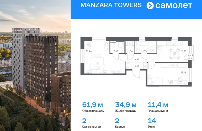 Строим кварталы для жизни с заботой о будущем. Предлагается 2-комнатная квартира комфорт-класса 61,94 кв.м в корпусе 2 на 14 этаже, в MANZARA TOWERS Квартира с предчистовой отделкой. Доступность дополнительных опций уточняйте у застройщика. Приобрести квартиру возможно по специальным акциям от застройщика, с текущими условиями акций можно ознакомиться в блоке «Акций». Цена динамическая и может отличаться, уточняйте актуальность у застройщика. Manzara Towers — это дома высотой от 7 до 24 этажей. В увеличенных окнах с зеркальной поверхностью отражаются облака и солнечные блики. Тихий двор с игровыми площадками и воркаут-пространством идеален для прогулок с кофе. На первом этаже есть выход на стилобат, где появятся зеленые оазисы и открытые террасы. Дома соединяет между собой частично прозрачный пешеходный мост. Предусмотрены подземный и 6-этажный многоуровневый паркинги. До ж/д вокзалов можно доехать за 20 минут. Или в обеденный перерыв встретиться с друзьями в центре города — дорога на машине займет около 15 минут. На первых этажах корпусов откроется детская поликлиника, ФОК с бассейном, магазины, кафе и салоны красоты. Для маленьких жителей уже работают 3 детских сада и лицей, до которых можно дойти за 6–15 минут. Во всех наших корпусах входы в светлые лобби находятся на уровне земли. На первом этаже есть специальные места для хранения колясок и велосипедов. #yan19-2r1785514#О застройщике