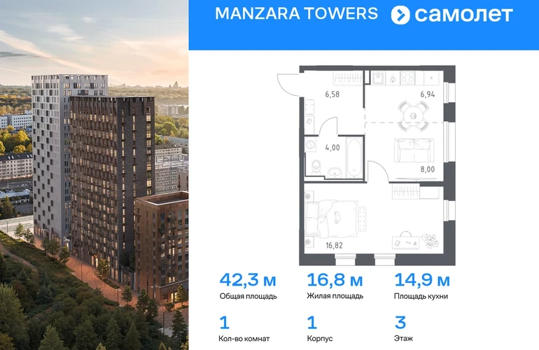 Предлагается 1-комнатная квартира комфорт-класса 42,34 кв.м в корпусе 1 на 3 этаже, в MANZARA TOWERS Квартира с предчистовой отделкой. Доступность дополнительных опций уточняйте у застройщика. Приобрести квартиру возможно по специальным акциям от застройщика, с текущими условиями акций можно ознакомиться в блоке “Акций”. Цена динамическая и может отличаться, уточняйте актуальность у застройщика. Manzara Towers — это дома высотой от 7 до 24 этажей. В увеличенных окнах с зеркальной поверхностью отражаются облака и солнечные блики. Тихий двор с игровыми площадками и воркаут-пространством идеален для прогулок с кофе. На первом этаже есть выход на стилобат, где появятся зеленые оазисы и открытые террасы. Дома соединяет между собой частично прозрачный пешеходный мост. Предусмотрены подземный и 6-этажный многоуровневый паркинги. До ж/д вокзалов можно доехать за 20 минут. Или в обеденный перерыв встретиться с друзьями в центре города — дорога на машине займет около 15 минут. На первых этажах корпусов откроется детская поликлиника, ФОК с бассейном, магазины, кафе и салоны красоты. Для маленьких жителей уже работают 3 детских сада и лицей, до которых можно дойти за 6–15 минут. Во всех наших корпусах входы в светлые лобби находятся на уровне земли. На первом этаже есть специальные места для хранения колясок и велосипедов. #yan19-2r1790391#О застройщике