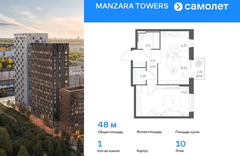 Строим кварталы для жизни с заботой о будущем. Предлагается 1-комнатная квартира комфорт-класса 47,96 кв.м в корпусе 4 на 10 этаже, в MANZARA TOWERS Квартира с предчистовой отделкой. Доступность дополнительных опций уточняйте у застройщика. Приобрести квартиру возможно по специальным акциям от застройщика, с текущими условиями акций можно ознакомиться в блоке «Акций». Цена динамическая и может отличаться, уточняйте актуальность у застройщика. Manzara Towers — это дома высотой от 7 до 24 этажей. В увеличенных окнах с зеркальной поверхностью отражаются облака и солнечные блики. Тихий двор с игровыми площадками и воркаут-пространством идеален для прогулок с кофе. На первом этаже есть выход на стилобат, где появятся зеленые оазисы и открытые террасы. Дома соединяет между собой частично прозрачный пешеходный мост. Предусмотрены подземный и 6-этажный многоуровневый паркинги. До ж/д вокзалов можно доехать за 20 минут. Или в обеденный перерыв встретиться с друзьями в центре города — дорога на машине займет около 15 минут. На первых этажах корпусов откроется детская поликлиника, ФОК с бассейном, магазины, кафе и салоны красоты. Для маленьких жителей уже работают 3 детских сада и лицей, до которых можно дойти за 6–15 минут. Во всех наших корпусах входы в светлые лобби находятся на уровне земли. На первом этаже есть специальные места для хранения колясок и велосипедов. #yan19-2r1791928#О застройщике