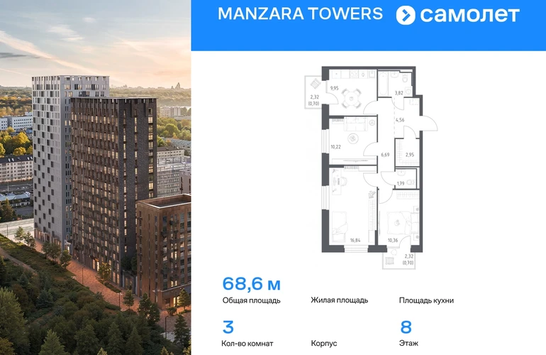 Строим кварталы для жизни с заботой о будущем. Предлагается 3-комнатная квартира комфорт-класса 68,58 кв.м в корпусе 4 на 8 этаже, в MANZARA TOWERS Квартира с предчистовой отделкой. Доступность дополнительных опций уточняйте у застройщика. Приобрести квартиру возможно по специальным акциям от застройщика, с текущими условиями акций можно ознакомиться в блоке «Акций». Цена динамическая и может отличаться, уточняйте актуальность у застройщика. Manzara Towers — это дома высотой от 7 до 24 этажей. В увеличенных окнах с зеркальной поверхностью отражаются облака и солнечные блики. Тихий двор с игровыми площадками и воркаут-пространством идеален для прогулок с кофе. На первом этаже есть выход на стилобат, где появятся зеленые оазисы и открытые террасы. Дома соединяет между собой частично прозрачный пешеходный мост. Предусмотрены подземный и 6-этажный многоуровневый паркинги. До ж/д вокзалов можно доехать за 20 минут. Или в обеденный перерыв встретиться с друзьями в центре города — дорога на машине займет около 15 минут. На первых этажах корпусов откроется детская поликлиника, ФОК с бассейном, магазины, кафе и салоны красоты. Для маленьких жителей уже работают 3 детских сада и лицей, до которых можно дойти за 6–15 минут. Во всех наших корпусах входы в светлые лобби находятся на уровне земли. На первом этаже есть специальные места для хранения колясок и велосипедов. #yan19-2r1791934#О застройщике
