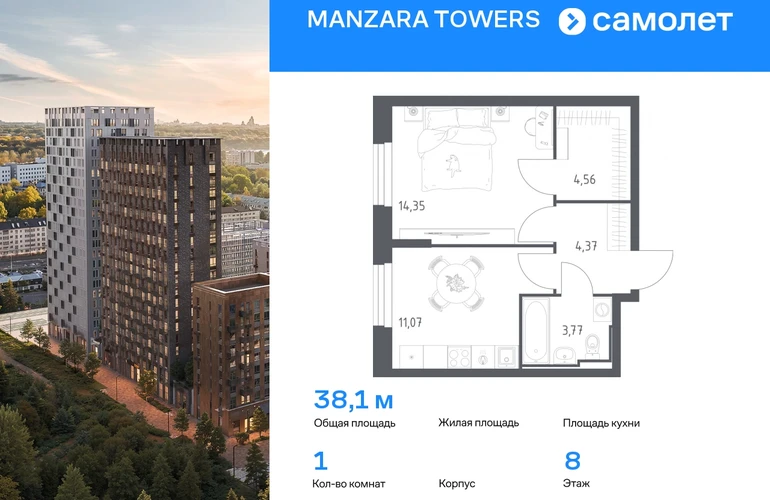 Строим кварталы для жизни с заботой о будущем. Предлагается 1-комнатная квартира комфорт-класса 38,12 кв.м в корпусе 4 на 8 этаже, в MANZARA TOWERS Квартира с предчистовой отделкой. Доступность дополнительных опций уточняйте у застройщика. Приобрести квартиру возможно по специальным акциям от застройщика, с текущими условиями акций можно ознакомиться в блоке «Акций». Цена динамическая и может отличаться, уточняйте актуальность у застройщика. Manzara Towers — это дома высотой от 7 до 24 этажей. В увеличенных окнах с зеркальной поверхностью отражаются облака и солнечные блики. Тихий двор с игровыми площадками и воркаут-пространством идеален для прогулок с кофе. На первом этаже есть выход на стилобат, где появятся зеленые оазисы и открытые террасы. Дома соединяет между собой частично прозрачный пешеходный мост. Предусмотрены подземный и 6-этажный многоуровневый паркинги. До ж/д вокзалов можно доехать за 20 минут. Или в обеденный перерыв встретиться с друзьями в центре города — дорога на машине займет около 15 минут. На первых этажах корпусов откроется детская поликлиника, ФОК с бассейном, магазины, кафе и салоны красоты. Для маленьких жителей уже работают 3 детских сада и лицей, до которых можно дойти за 6–15 минут. Во всех наших корпусах входы в светлые лобби находятся на уровне земли. На первом этаже есть специальные места для хранения колясок и велосипедов. #yan19-2r1791935#О застройщике