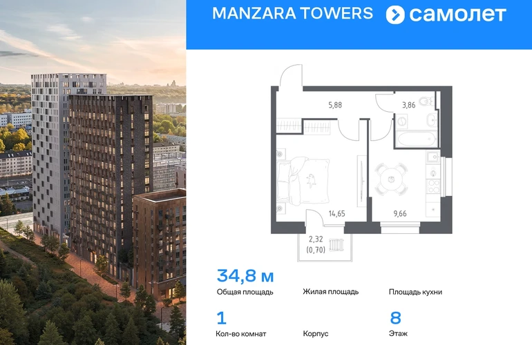 Строим кварталы для жизни с заботой о будущем. Предлагается 1-комнатная квартира комфорт-класса 34,75 кв.м в корпусе 5 на 8 этаже, в MANZARA TOWERS Квартира с черновой отделкой. Доступность опции «отделка» и возможность комплектации мебелью и декором уточняйте у застройщика. Приобрести квартиру возможно по специальным акциям от застройщика, с текущими условиями акций можно ознакомиться в блоке «Акций». Цена динамическая и может отличаться, уточняйте актуальность у застройщика. Manzara Towers — это дома высотой от 7 до 24 этажей. В увеличенных окнах с зеркальной поверхностью отражаются облака и солнечные блики. Тихий двор с игровыми площадками и воркаут-пространством идеален для прогулок с кофе. На первом этаже есть выход на стилобат, где появятся зеленые оазисы и открытые террасы. Дома соединяет между собой частично прозрачный пешеходный мост. Предусмотрены подземный и 6-этажный многоуровневый паркинги. До ж/д вокзалов можно доехать за 20 минут. Или в обеденный перерыв встретиться с друзьями в центре города — дорога на машине займет около 15 минут. На первых этажах корпусов откроется детская поликлиника, ФОК с бассейном, магазины, кафе и салоны красоты. Для маленьких жителей уже работают 3 детских сада и лицей, до которых можно дойти за 6–15 минут. Во всех наших корпусах входы в светлые лобби находятся на уровне земли. На первом этаже есть специальные места для хранения колясок и велосипедов. #yan19-2r1791966#О застройщике