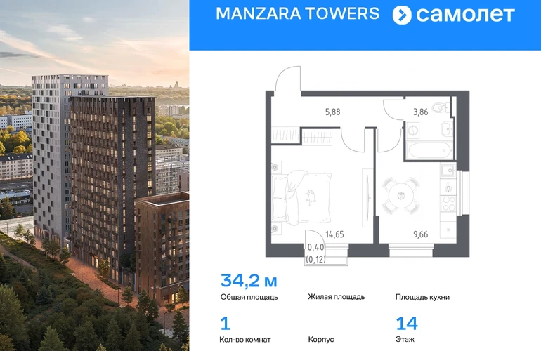 Строим кварталы для жизни с заботой о будущем. Предлагается 1-комнатная квартира комфорт-класса 34,17 кв.м в корпусе 5 на 14 этаже, в MANZARA TOWERS Квартира с черновой отделкой. Доступность опции «отделка» и возможность комплектации мебелью и декором уточняйте у застройщика. Приобрести квартиру возможно по специальным акциям от застройщика, с текущими условиями акций можно ознакомиться в блоке «Акций». Цена динамическая и может отличаться, уточняйте актуальность у застройщика. Manzara Towers — это дома высотой от 7 до 24 этажей. В увеличенных окнах с зеркальной поверхностью отражаются облака и солнечные блики. Тихий двор с игровыми площадками и воркаут-пространством идеален для прогулок с кофе. На первом этаже есть выход на стилобат, где появятся зеленые оазисы и открытые террасы. Дома соединяет между собой частично прозрачный пешеходный мост. Предусмотрены подземный и 6-этажный многоуровневый паркинги. До ж/д вокзалов можно доехать за 20 минут. Или в обеденный перерыв встретиться с друзьями в центре города — дорога на машине займет около 15 минут. На первых этажах корпусов откроется детская поликлиника, ФОК с бассейном, магазины, кафе и салоны красоты. Для маленьких жителей уже работают 3 детских сада и лицей, до которых можно дойти за 6–15 минут. Во всех наших корпусах входы в светлые лобби находятся на уровне земли. На первом этаже есть специальные места для хранения колясок и велосипедов. #yan19-2r1791969#О застройщике
