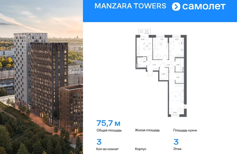 Строим кварталы для жизни с заботой о будущем. Предлагается 3-комнатная квартира комфорт-класса 75,72 кв.м в корпусе 5 на 3 этаже, в MANZARA TOWERS Квартира с предчистовой отделкой. Доступность дополнительных опций уточняйте у застройщика. Приобрести квартиру возможно по специальным акциям от застройщика, с текущими условиями акций можно ознакомиться в блоке «Акций». Цена динамическая и может отличаться, уточняйте актуальность у застройщика. Manzara Towers — это дома высотой от 7 до 24 этажей. В увеличенных окнах с зеркальной поверхностью отражаются облака и солнечные блики. Тихий двор с игровыми площадками и воркаут-пространством идеален для прогулок с кофе. На первом этаже есть выход на стилобат, где появятся зеленые оазисы и открытые террасы. Дома соединяет между собой частично прозрачный пешеходный мост. Предусмотрены подземный и 6-этажный многоуровневый паркинги. До ж/д вокзалов можно доехать за 20 минут. Или в обеденный перерыв встретиться с друзьями в центре города — дорога на машине займет около 15 минут. На первых этажах корпусов откроется детская поликлиника, ФОК с бассейном, магазины, кафе и салоны красоты. Для маленьких жителей уже работают 3 детских сада и лицей, до которых можно дойти за 6–15 минут. Во всех наших корпусах входы в светлые лобби находятся на уровне земли. На первом этаже есть специальные места для хранения колясок и велосипедов. #yan19-2r1791973#О застройщике