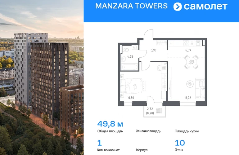 Строим кварталы для жизни с заботой о будущем. Предлагается 1-комнатная квартира комфорт-класса 49,79 кв.м в корпусе 5 на 10 этаже, в MANZARA TOWERS Квартира с предчистовой отделкой. Доступность дополнительных опций уточняйте у застройщика. Приобрести квартиру возможно по специальным акциям от застройщика, с текущими условиями акций можно ознакомиться в блоке «Акций». Цена динамическая и может отличаться, уточняйте актуальность у застройщика. Manzara Towers — это дома высотой от 7 до 24 этажей. В увеличенных окнах с зеркальной поверхностью отражаются облака и солнечные блики. Тихий двор с игровыми площадками и воркаут-пространством идеален для прогулок с кофе. На первом этаже есть выход на стилобат, где появятся зеленые оазисы и открытые террасы. Дома соединяет между собой частично прозрачный пешеходный мост. Предусмотрены подземный и 6-этажный многоуровневый паркинги. До ж/д вокзалов можно доехать за 20 минут. Или в обеденный перерыв встретиться с друзьями в центре города — дорога на машине займет около 15 минут. На первых этажах корпусов откроется детская поликлиника, ФОК с бассейном, магазины, кафе и салоны красоты. Для маленьких жителей уже работают 3 детских сада и лицей, до которых можно дойти за 6–15 минут. Во всех наших корпусах входы в светлые лобби находятся на уровне земли. На первом этаже есть специальные места для хранения колясок и велосипедов. #yan19-2r1791977#О застройщике