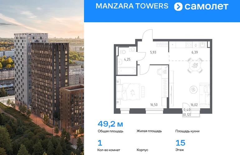 Строим кварталы для жизни с заботой о будущем. Предлагается 1-комнатная квартира комфорт-класса 49,21 кв.м в корпусе 5 на 15 этаже, в MANZARA TOWERS Квартира с предчистовой отделкой. Доступность дополнительных опций уточняйте у застройщика. Приобрести квартиру возможно по специальным акциям от застройщика, с текущими условиями акций можно ознакомиться в блоке «Акций». Цена динамическая и может отличаться, уточняйте актуальность у застройщика. Manzara Towers — это дома высотой от 7 до 24 этажей. В увеличенных окнах с зеркальной поверхностью отражаются облака и солнечные блики. Тихий двор с игровыми площадками и воркаут-пространством идеален для прогулок с кофе. На первом этаже есть выход на стилобат, где появятся зеленые оазисы и открытые террасы. Дома соединяет между собой частично прозрачный пешеходный мост. Предусмотрены подземный и 6-этажный многоуровневый паркинги. До ж/д вокзалов можно доехать за 20 минут. Или в обеденный перерыв встретиться с друзьями в центре города — дорога на машине займет около 15 минут. На первых этажах корпусов откроется детская поликлиника, ФОК с бассейном, магазины, кафе и салоны красоты. Для маленьких жителей уже работают 3 детских сада и лицей, до которых можно дойти за 6–15 минут. Во всех наших корпусах входы в светлые лобби находятся на уровне земли. На первом этаже есть специальные места для хранения колясок и велосипедов. #yan19-2r1791978#О застройщике