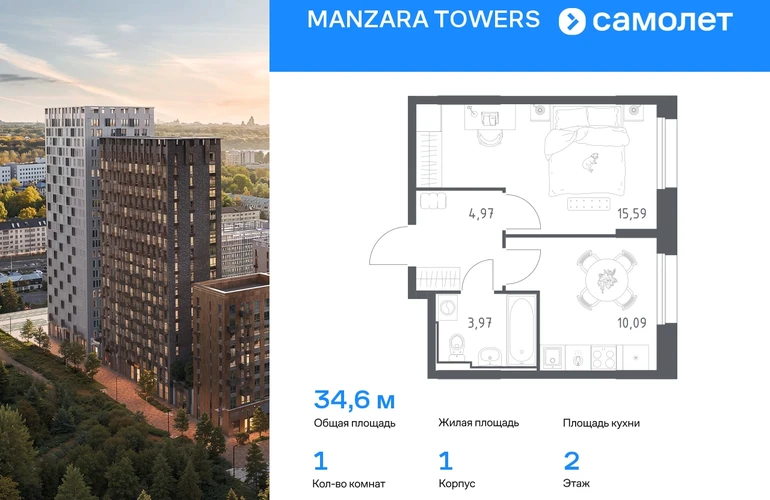 Предлагается 1-комнатная квартира комфорт-класса 34,62 кв.м в корпусе 1 на 2 этаже, в MANZARA TOWERS Квартира с предчистовой отделкой. Доступность дополнительных опций уточняйте у застройщика. Приобрести квартиру возможно по специальным акциям от застройщика, с текущими условиями акций можно ознакомиться в блоке “Акций”. Цена динамическая и может отличаться, уточняйте актуальность у застройщика. Manzara Towers — это дома высотой от 7 до 24 этажей. В увеличенных окнах с зеркальной поверхностью отражаются облака и солнечные блики. Тихий двор с игровыми площадками и воркаут-пространством идеален для прогулок с кофе. На первом этаже есть выход на стилобат, где появятся зеленые оазисы и открытые террасы. Дома соединяет между собой частично прозрачный пешеходный мост. Предусмотрены подземный и 6-этажный многоуровневый паркинги. До ж/д вокзалов можно доехать за 20 минут. Или в обеденный перерыв встретиться с друзьями в центре города — дорога на машине займет около 15 минут. На первых этажах корпусов откроется детская поликлиника, ФОК с бассейном, магазины, кафе и салоны красоты. Для маленьких жителей уже работают 3 детских сада и лицей, до которых можно дойти за 6–15 минут. Во всех наших корпусах входы в светлые лобби находятся на уровне земли. На первом этаже есть специальные места для хранения колясок и велосипедов. #yan19-2r1791981#О застройщике