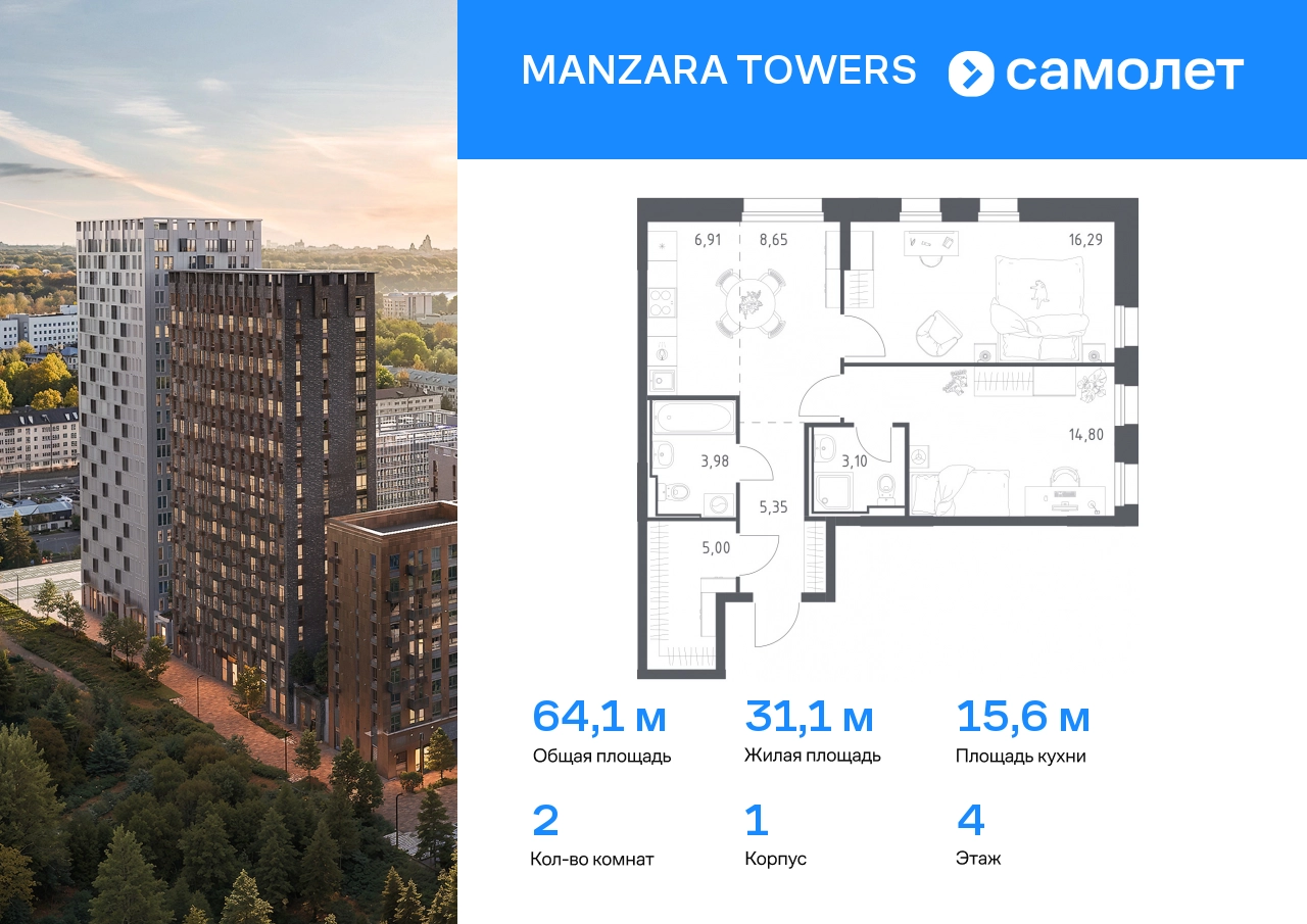 Предлагается 2-комнатная квартира комфорт-класса 64,08 кв.м в корпусе 1 на 4 этаже, в MANZARA TOWERS Квартира с предчистовой отделкой. Доступность дополнительных опций уточняйте у застройщика. Приобрести квартиру возможно по специальным акциям от застройщика, с текущими условиями акций можно ознакомиться в блоке “Акций”. Цена динамическая и может отличаться, уточняйте актуальность у застройщика. Manzara Towers — это дома высотой от 7 до 24 этажей. В увеличенных окнах с зеркальной поверхностью отражаются облака и солнечные блики. Тихий двор с игровыми площадками и воркаут-пространством идеален для прогулок с кофе. На первом этаже есть выход на стилобат, где появятся зеленые оазисы и открытые террасы. Дома соединяет между собой частично прозрачный пешеходный мост. Предусмотрены подземный и 6-этажный многоуровневый паркинги. До ж/д вокзалов можно доехать за 20 минут. Или в обеденный перерыв встретиться с друзьями в центре города — дорога на машине займет около 15 минут. На первых этажах корпусов откроется детская поликлиника, ФОК с бассейном, магазины, кафе и салоны красоты. Для маленьких жителей уже работают 3 детских сада и лицей, до которых можно дойти за 6–15 минут. Во всех наших корпусах входы в светлые лобби находятся на уровне земли. На первом этаже есть специальные места для хранения колясок и велосипедов. #yan19-2r1791982#О застройщике