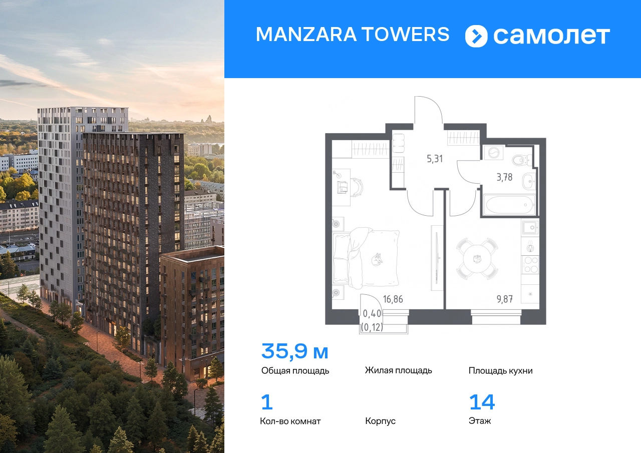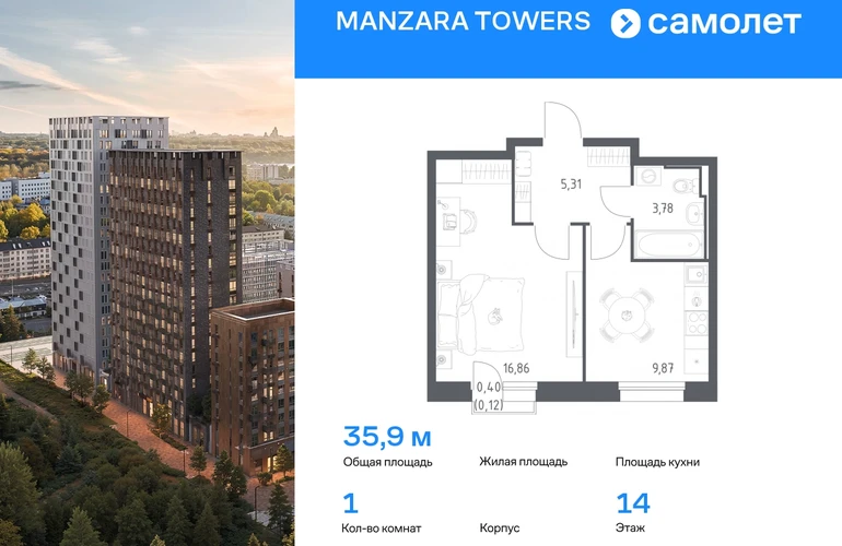 Предлагается 1-комнатная квартира комфорт-класса 35,94 кв.м в корпусе 5 на 14 этаже, в MANZARA TOWERS Квартира с черновой отделкой. Доступность опции «отделка» и возможность комплектации мебелью и декором уточняйте у застройщика. Приобрести квартиру возможно по специальным акциям от застройщика, с текущими условиями акций можно ознакомиться в блоке «Акций». Цена динамическая и может отличаться, уточняйте актуальность у застройщика. Manzara Towers — это дома высотой от 7 до 24 этажей. В увеличенных окнах с зеркальной поверхностью отражаются облака и солнечные блики. Тихий двор с игровыми площадками и воркаут-пространством идеален для прогулок с кофе. На первом этаже есть выход на стилобат, где появятся зеленые оазисы и открытые террасы. Дома соединяет между собой частично прозрачный пешеходный мост. Предусмотрены подземный и 6-этажный многоуровневый паркинги. До ж/д вокзалов можно доехать за 20 минут. Или в обеденный перерыв встретиться с друзьями в центре города — дорога на машине займет около 15 минут. На первых этажах корпусов откроется детская поликлиника, ФОК с бассейном, магазины, кафе и салоны красоты. Для маленьких жителей уже работают 3 детских сада и лицей, до которых можно дойти за 6–15 минут. Во всех наших корпусах входы в светлые лобби находятся на уровне земли. На первом этаже есть специальные места для хранения колясок и велосипедов. #yan19-2r1792228#О застройщике