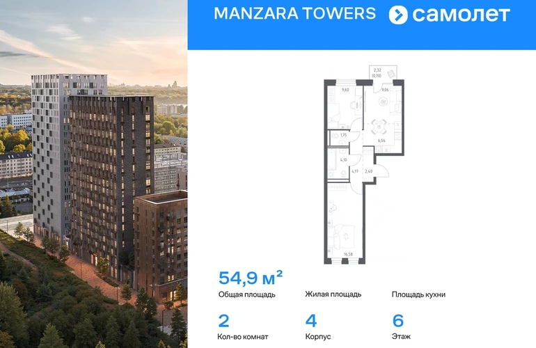 Предлагается 2-комнатная квартира комфорт-класса 54,92 кв.м в корпусе 4 на 6 этаже, в MANZARA TOWERS Квартира с черновой отделкой. Доступность опции «отделка» и возможность комплектации мебелью и декором уточняйте у застройщика. Приобрести квартиру возможно по специальным акциям от застройщика, с текущими условиями акций можно ознакомиться в блоке «Акций». Цена динамическая и может отличаться, уточняйте актуальность у застройщика. Manzara Towers — это дома высотой от 7 до 24 этажей. В увеличенных окнах с зеркальной поверхностью отражаются облака и солнечные блики. Тихий двор с игровыми площадками и воркаут-пространством идеален для прогулок с кофе. На первом этаже есть выход на стилобат, где появятся зеленые оазисы и открытые террасы. Дома соединяет между собой частично прозрачный пешеходный мост. Предусмотрены подземный и 6-этажный многоуровневый паркинги. До ж/д вокзалов можно доехать за 20 минут. Или в обеденный перерыв встретиться с друзьями в центре города — дорога на машине займет около 15 минут. На первых этажах корпусов откроется детская поликлиника, ФОК с бассейном, магазины, кафе и салоны красоты. Для маленьких жителей уже работают 3 детских сада и лицей, до которых можно дойти за 6–15 минут. Во всех наших корпусах входы в светлые лобби находятся на уровне земли. На первом этаже есть специальные места для хранения колясок и велосипедов. #yan19-2r1807973#О застройщике