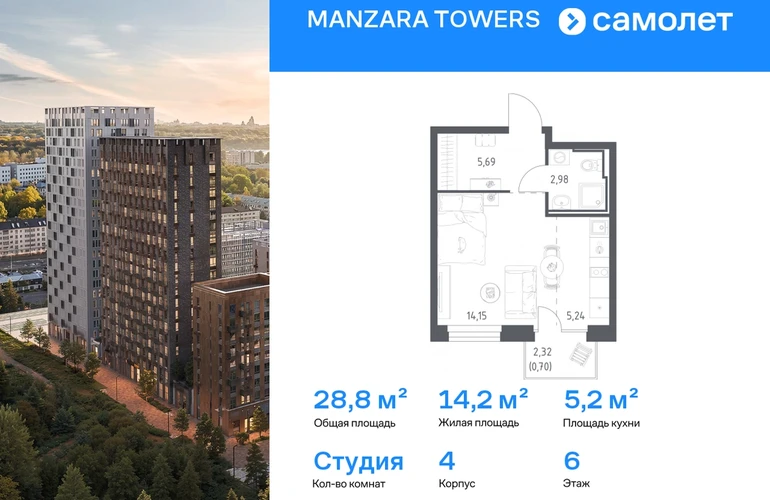 Строим кварталы для жизни с заботой о будущем. Предлагается квартира студия комфорт-класса 28,76 кв.м в корпусе 4 на 6 этаже, в MANZARA TOWERS Квартира с чистовой отделкой. Доступность дополнительных опций уточняйте у застройщика. Приобрести квартиру возможно по специальным акциям от застройщика, с текущими условиями акций можно ознакомиться в блоке «Акций». Цена динамическая и может отличаться, уточняйте актуальность у застройщика. Manzara Towers — это дома высотой от 7 до 24 этажей. В увеличенных окнах с зеркальной поверхностью отражаются облака и солнечные блики. Тихий двор с игровыми площадками и воркаут-пространством идеален для прогулок с кофе. На первом этаже есть выход на стилобат, где появятся зеленые оазисы и открытые террасы. Дома соединяет между собой частично прозрачный пешеходный мост. Предусмотрены подземный и 6-этажный многоуровневый паркинги. До ж/д вокзалов можно доехать за 20 минут. Или в обеденный перерыв встретиться с друзьями в центре города — дорога на машине займет около 15 минут. На первых этажах корпусов откроется детская поликлиника, ФОК с бассейном, магазины, кафе и салоны красоты. Для маленьких жителей уже работают 3 детских сада и лицей, до которых можно дойти за 6–15 минут. Во всех наших корпусах входы в светлые лобби находятся на уровне земли. На первом этаже есть специальные места для хранения колясок и велосипедов. #yan19-2r1807975#О застройщике