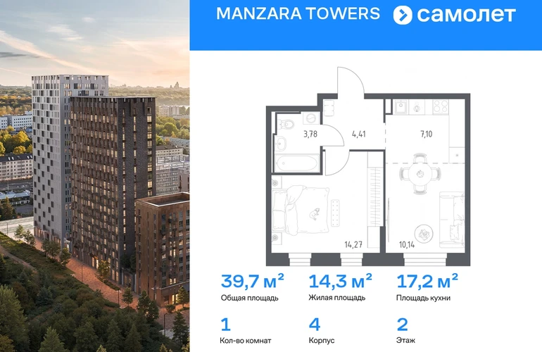 Строим кварталы для жизни с заботой о будущем. Предлагается 1-комнатная квартира комфорт-класса 39,7 кв.м в корпусе 4 на 2 этаже, в MANZARA TOWERS Квартира с чистовой отделкой. Доступность дополнительных опций уточняйте у застройщика. Приобрести квартиру возможно по специальным акциям от застройщика, с текущими условиями акций можно ознакомиться в блоке «Акций». Цена динамическая и может отличаться, уточняйте актуальность у застройщика. Manzara Towers — это дома высотой от 7 до 24 этажей. В увеличенных окнах с зеркальной поверхностью отражаются облака и солнечные блики. Тихий двор с игровыми площадками и воркаут-пространством идеален для прогулок с кофе. На первом этаже есть выход на стилобат, где появятся зеленые оазисы и открытые террасы. Дома соединяет между собой частично прозрачный пешеходный мост. Предусмотрены подземный и 6-этажный многоуровневый паркинги. До ж/д вокзалов можно доехать за 20 минут. Или в обеденный перерыв встретиться с друзьями в центре города — дорога на машине займет около 15 минут. На первых этажах корпусов откроется детская поликлиника, ФОК с бассейном, магазины, кафе и салоны красоты. Для маленьких жителей уже работают 3 детских сада и лицей, до которых можно дойти за 6–15 минут. Во всех наших корпусах входы в светлые лобби находятся на уровне земли. На первом этаже есть специальные места для хранения колясок и велосипедов. #yan19-2r1814427#О застройщике