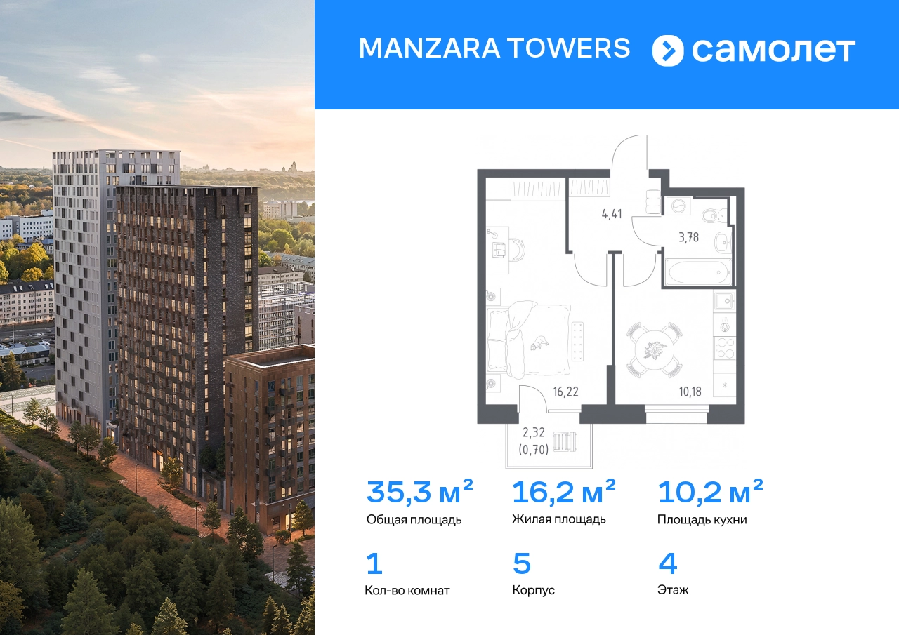 Строим кварталы для жизни с заботой о будущем. Предлагается 1-комнатная квартира комфорт-класса 35,29 кв.м в корпусе 5 на 4 этаже, в MANZARA TOWERS Квартира с черновой отделкой. Доступность опции «отделка» и возможность комплектации мебелью и декором уточняйте у застройщика. Приобрести квартиру возможно по специальным акциям от застройщика, с текущими условиями акций можно ознакомиться в блоке «Акций». Цена динамическая и может отличаться, уточняйте актуальность у застройщика. Manzara Towers — это дома высотой от 7 до 24 этажей. В увеличенных окнах с зеркальной поверхностью отражаются облака и солнечные блики. Тихий двор с игровыми площадками и воркаут-пространством идеален для прогулок с кофе. На первом этаже есть выход на стилобат, где появятся зеленые оазисы и открытые террасы. Дома соединяет между собой частично прозрачный пешеходный мост. Предусмотрены подземный и 6-этажный многоуровневый паркинги. До ж/д вокзалов можно доехать за 20 минут. Или в обеденный перерыв встретиться с друзьями в центре города — дорога на машине займет около 15 минут. На первых этажах корпусов откроется детская поликлиника, ФОК с бассейном, магазины, кафе и салоны красоты. Для маленьких жителей уже работают 3 детских сада и лицей, до которых можно дойти за 6–15 минут. Во всех наших корпусах входы в светлые лобби находятся на уровне земли. На первом этаже есть специальные места для хранения колясок и велосипедов. #yan19-2r1814433#О застройщике